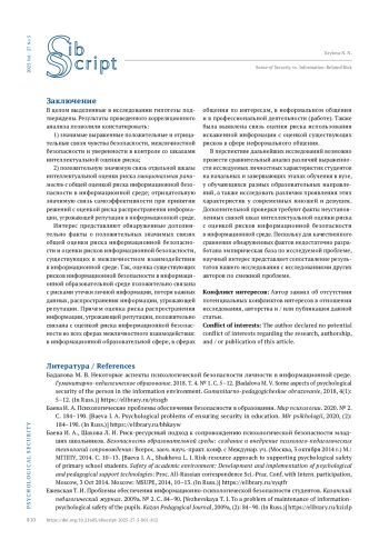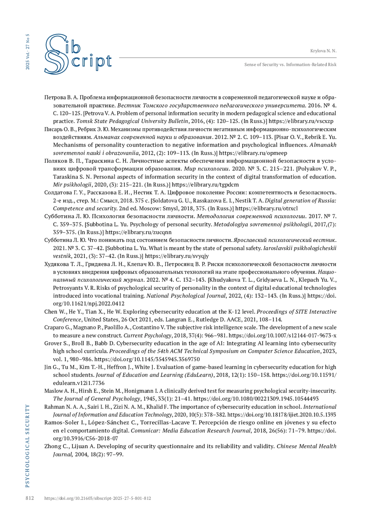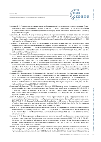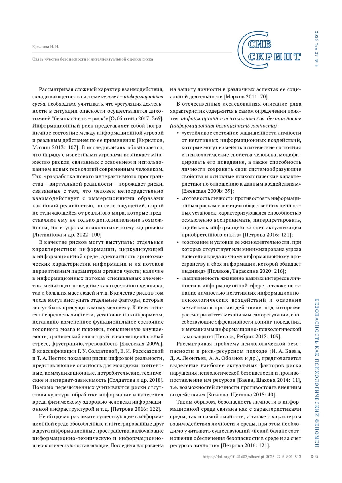 КРЫЛОВА Н. Н. СВЯЗЬ ЧУВСТВА БЕЗОПАСНОСТИ И ИНТЕЛЛЕКТУАЛЬНОЙ ОЦЕНКИ РИСКА БЕЗОПАСНОСТИ В ИНФОРМАЦИОННОЙ СРЕДЕ У СТУДЕНТОВ // СИБСКРИПТ. 2025. Т. 27, № 5