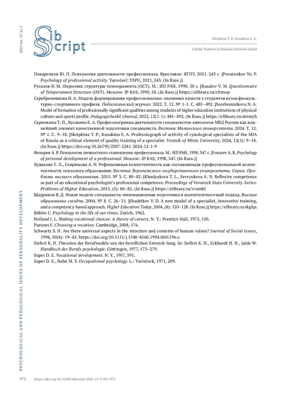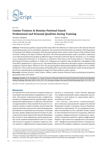 12. Кусакина Е. А. Критерии профессионального становления специалистов-кинологов силовых ведомств. Вестник Ленинградского государственного университета им. А. С. Пушкина. 2023. № 4. С. 457-473. https://doi.org/10.35231/18186653_2023_4_457