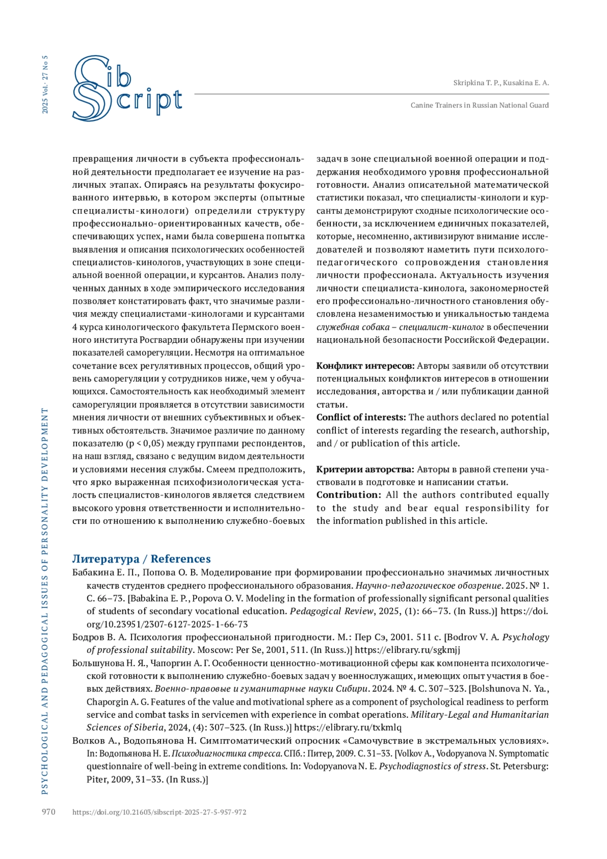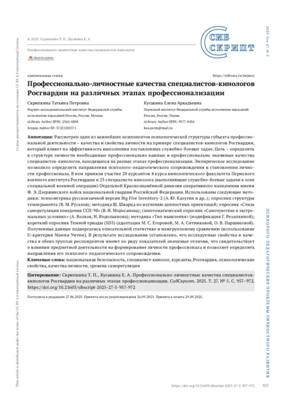 Рассмотрен один из важнейших компонентов психологической структуры субъекта профессиональной деятельности – качества и свойства личности на примере специалистов-кинологов Росгвардии, который влияет на эффективность выполнения поставленных служебно-боевых задач. Цель – определить в структуре личности необходимые профессионально важные и профессионально значимые качества специалистов-кинологов, находящихся на разных этапах профессионализации. Эмпирическое исследование позволило определить направления психолого-педагогического сопровождения в становлении личности профессионала. В нем приняли участие 20 курсантов 4 курса кинологического факультета Пермского военного института Росгвардии и 23 специалиста-кинолога (выполняющие служебно-боевые задачи в зоне специальной военной операции) Отдельной Краснознамённой дивизии оперативного назначения имени Ф. Э. Дзержинского войск национальной гвардии Российской Федерации. Использованы следующие методики: психометрика русскоязычной версии Big Five Inventory-2 (А. Ю. Калугин и др..); опросник структуры темперамента (В. М. Русалов); методика Ш. Шварца по изучению ценностных ориентаций; опросник «Стиль саморегуляции поведения ССП-98» (В. И. Моросанова); симптоматический опросник «Самочувствие в экстремальных условиях» (А. Волков, Н. Водопьянова); методика «Тип мышления» (модификация Г. Резапкиной); короткий опросник Темной триады (SD3) (адаптация М. С. Егоровой, М. А. Ситниковой, О. В. Паршиковой). Полученные данные подвергались описательной статистике и межгрупповому сравнению (использование U-критерия Манна-Уитни). В результате исследования установлено, что исследуемые свойства и качества в обеих группах респондентов имеют по ряду показателей значимые отличия, что свидетельствует о влиянии предметной деятельности на формирование личности профессионала и позволяет определить направления его психолого-педагогического сопровождения.
