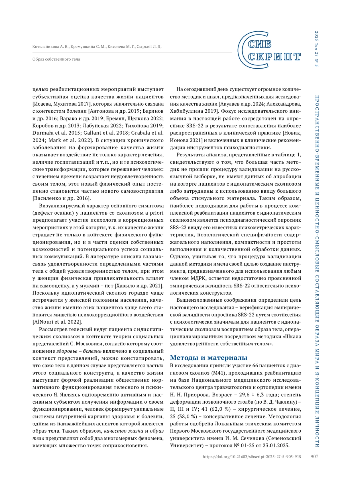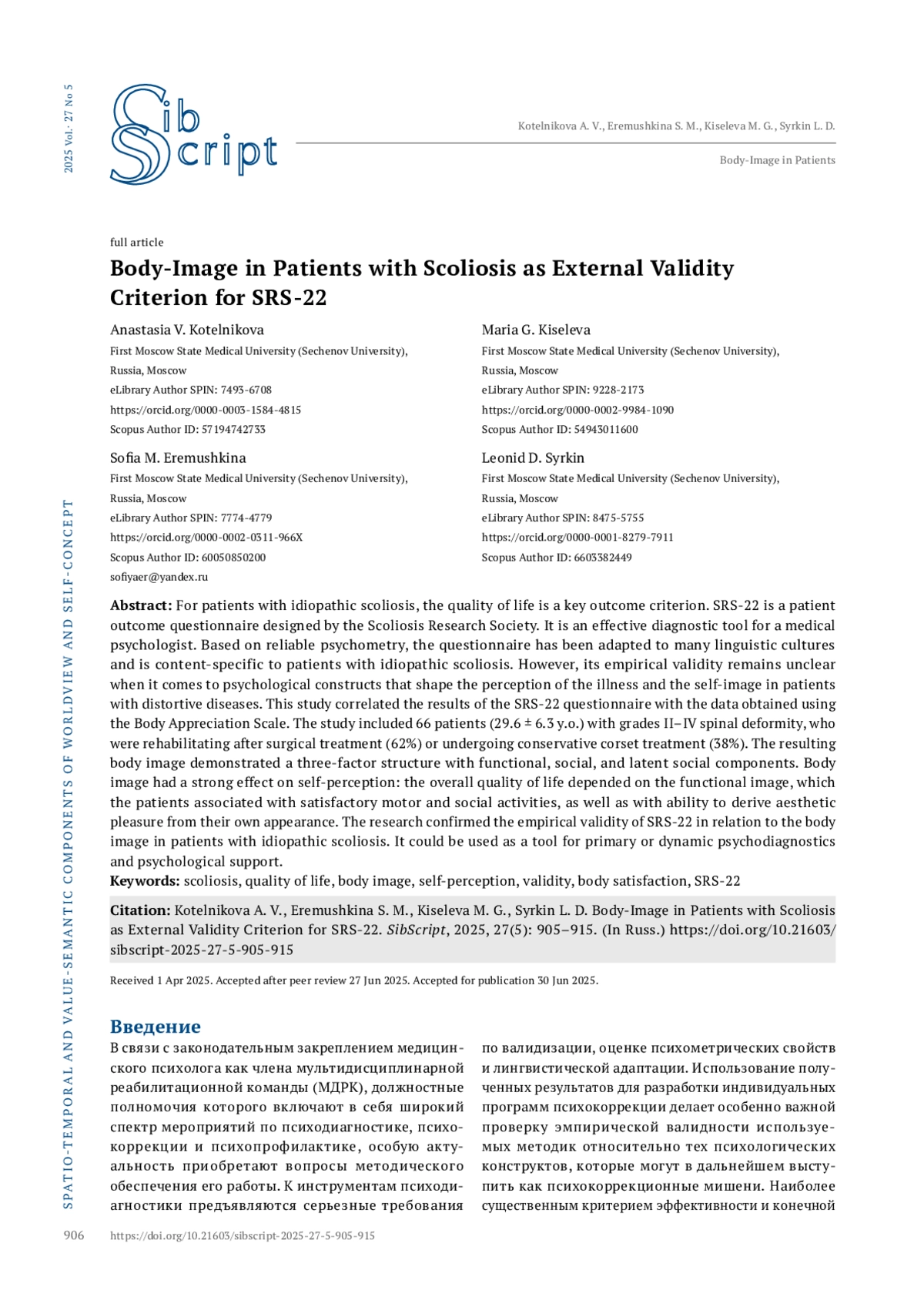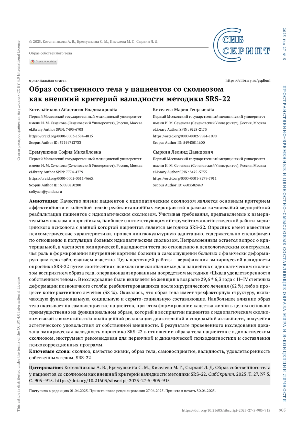 КОТЕЛЬНИКОВА А. В., ЕРЕМУШКИНА С. М., КИСЕЛЕВА М. Г., СЫРКИН Л. Д. ОБРАЗ СОБСТВЕННОГО ТЕЛА У ПАЦИЕНТОВ СО СКОЛИОЗОМ КАК ВНЕШНИЙ КРИТЕРИЙ ВАЛИДНОСТИ МЕТОДИКИ SRS-22 // СИБСКРИПТ. 2025. Т. 27, № 5