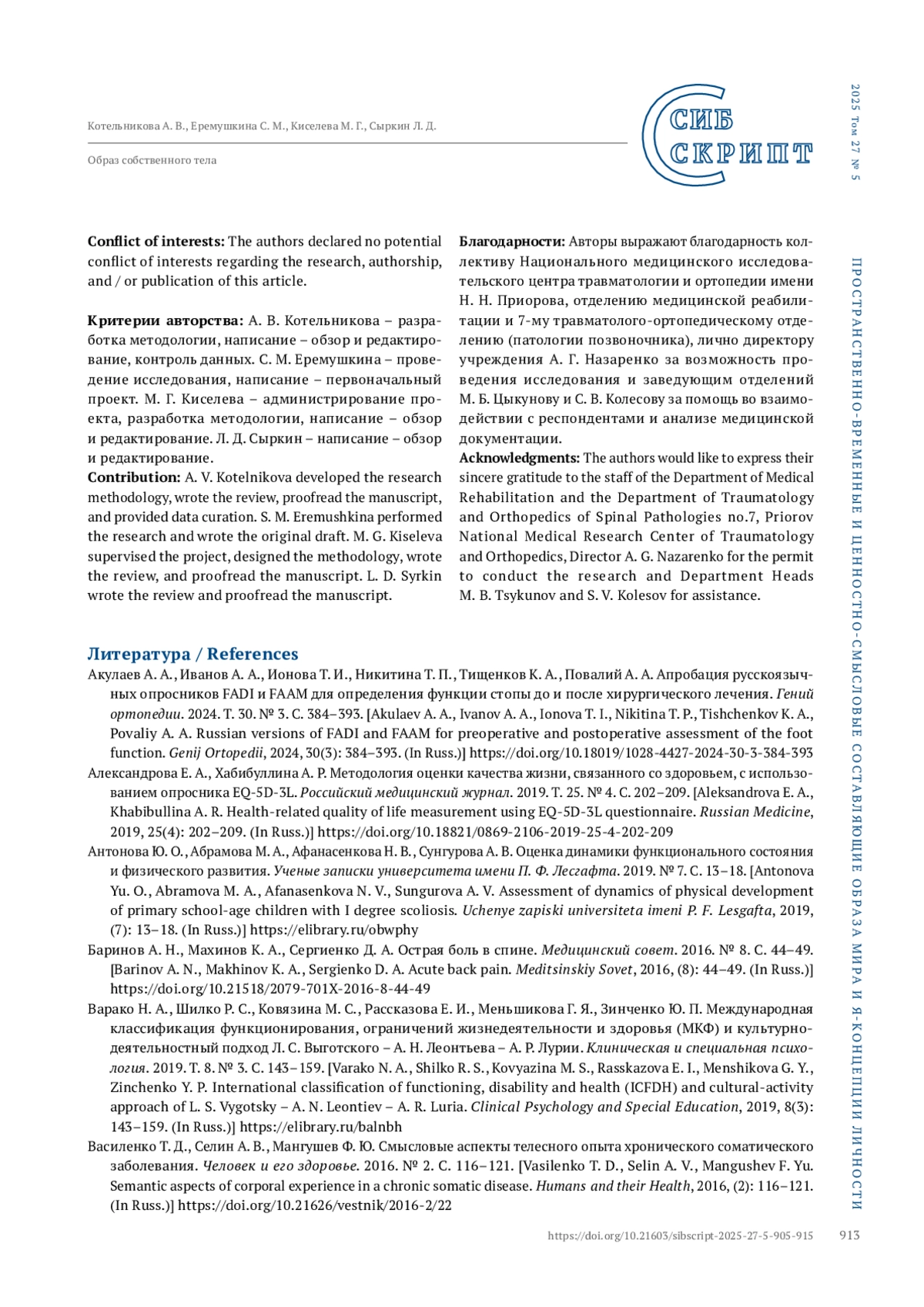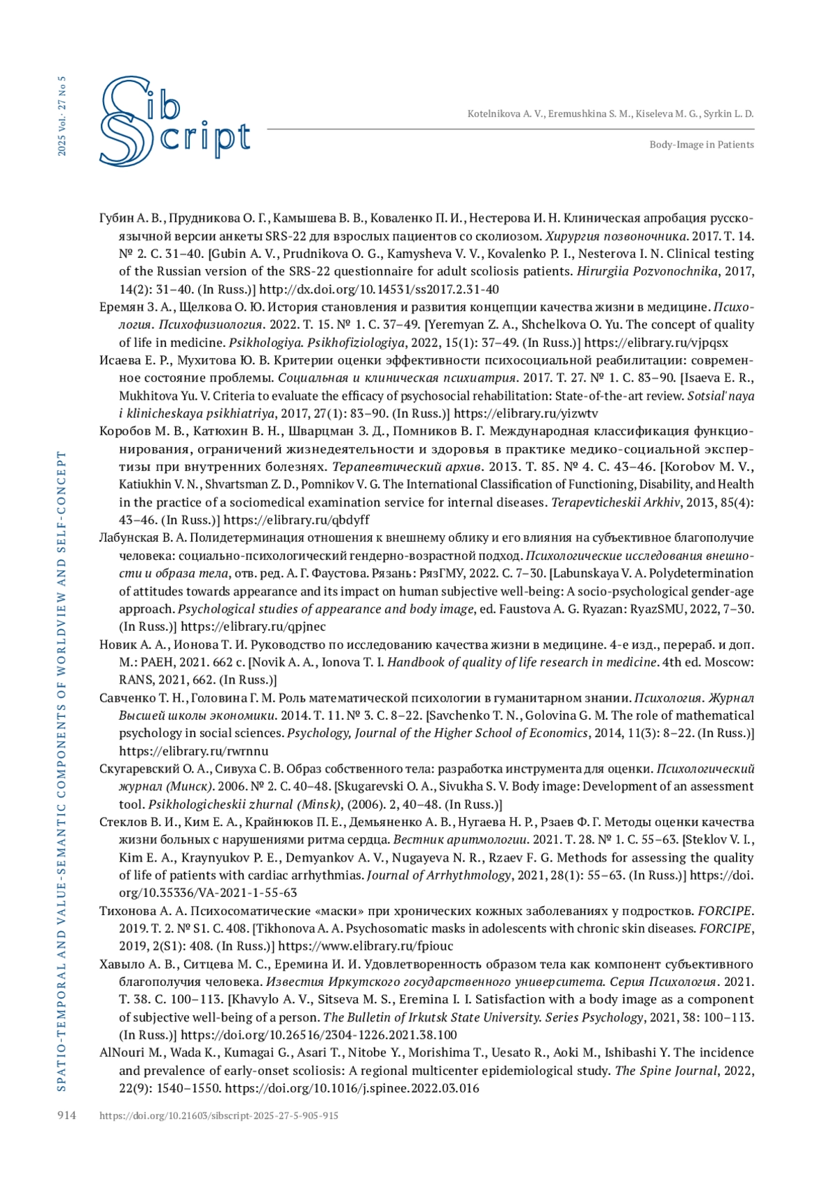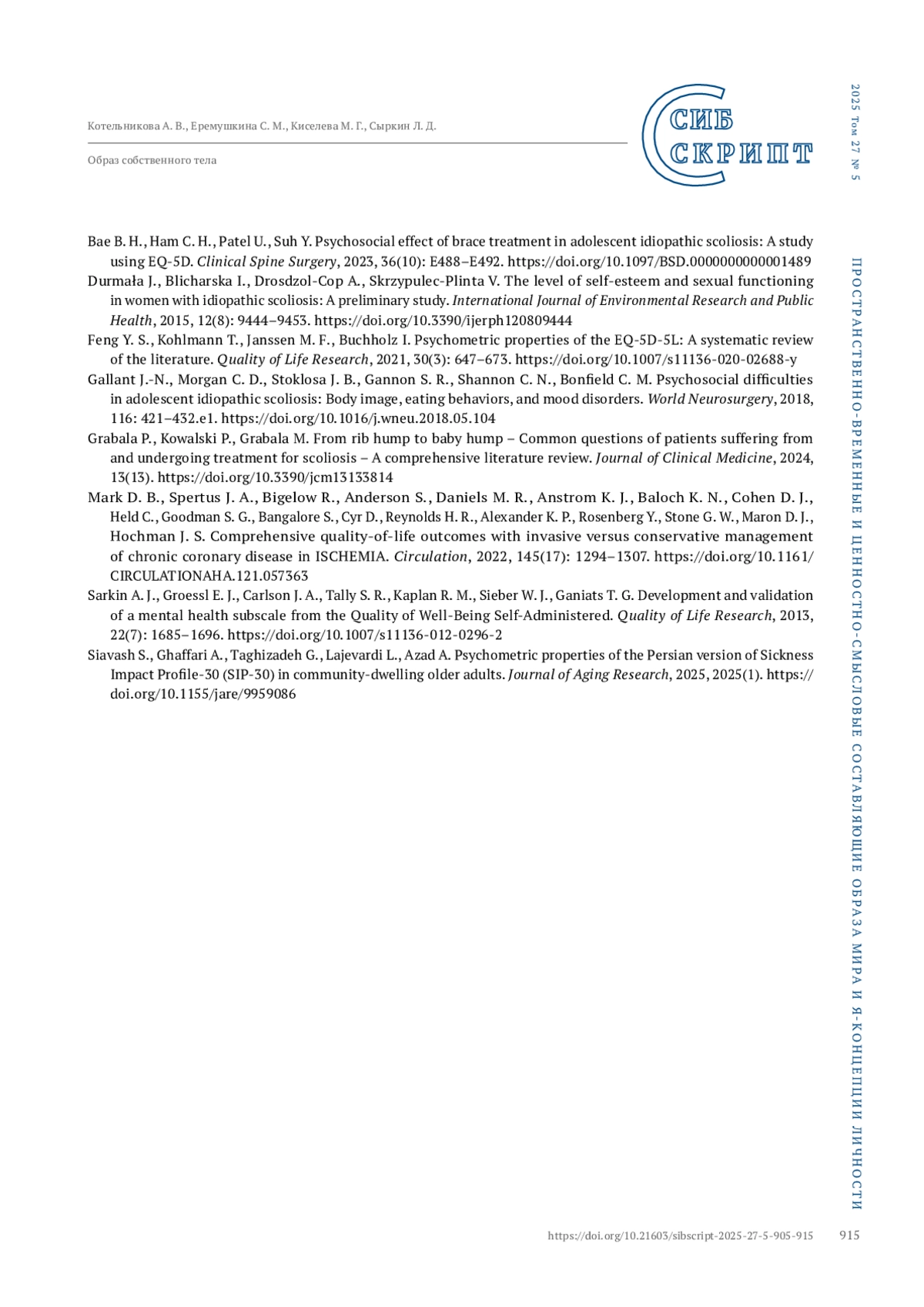 КОТЕЛЬНИКОВА А. В., ЕРЕМУШКИНА С. М., КИСЕЛЕВА М. Г., СЫРКИН Л. Д. ОБРАЗ СОБСТВЕННОГО ТЕЛА У ПАЦИЕНТОВ СО СКОЛИОЗОМ КАК ВНЕШНИЙ КРИТЕРИЙ ВАЛИДНОСТИ МЕТОДИКИ SRS-22 // СИБСКРИПТ. 2025. Т. 27, № 5