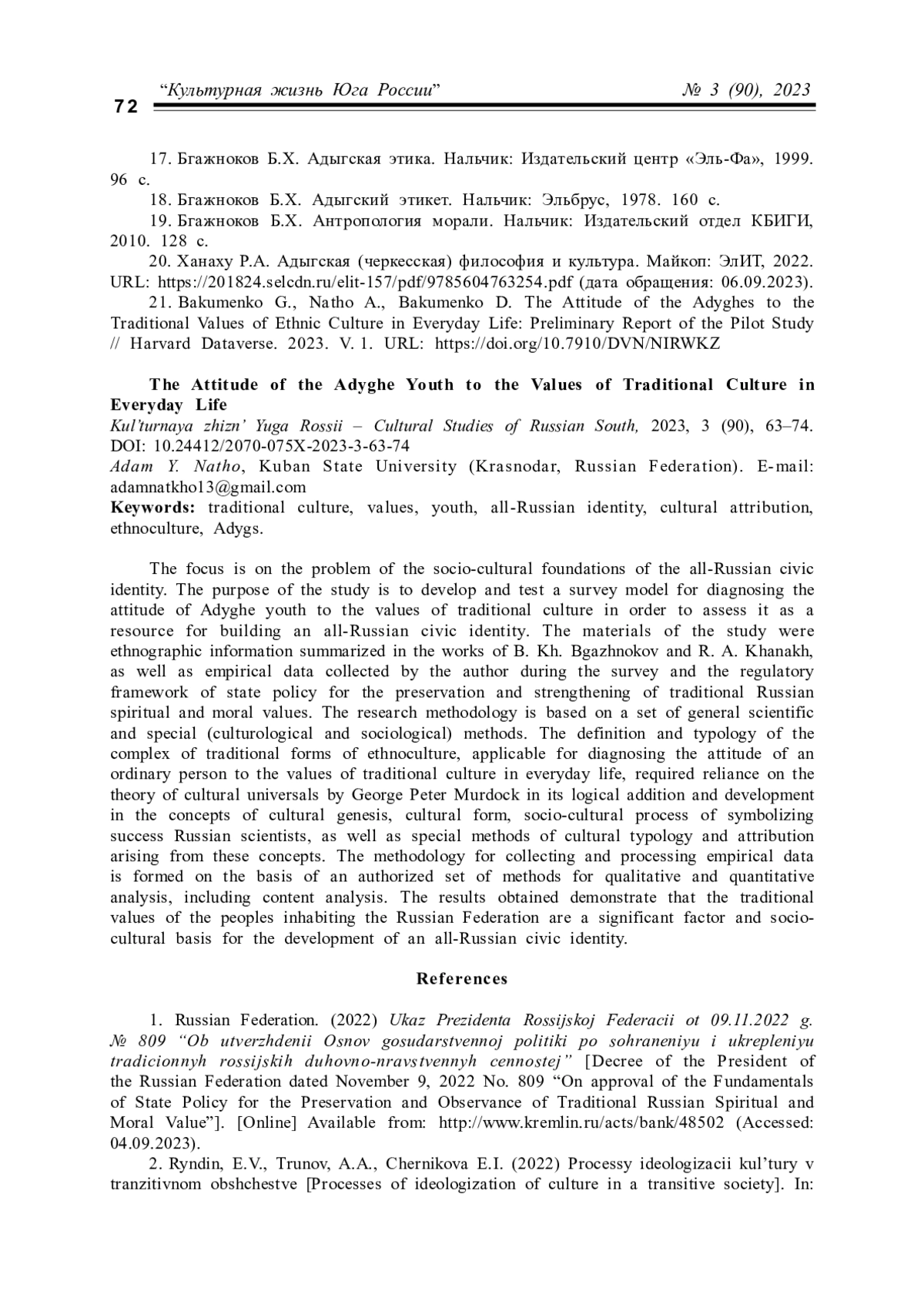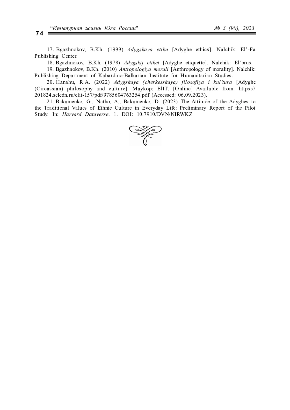 21. Bakumenko G., Natho A., Bakumenko D. The Attitude of the Adyghes to the Traditional Values of Ethnic Culture in Everyday Life: Preliminary Report of the Pilot Study // Harvard Dataverse. 2023. V. 1. DOI: 10.7910/DVN/NIRWKZ