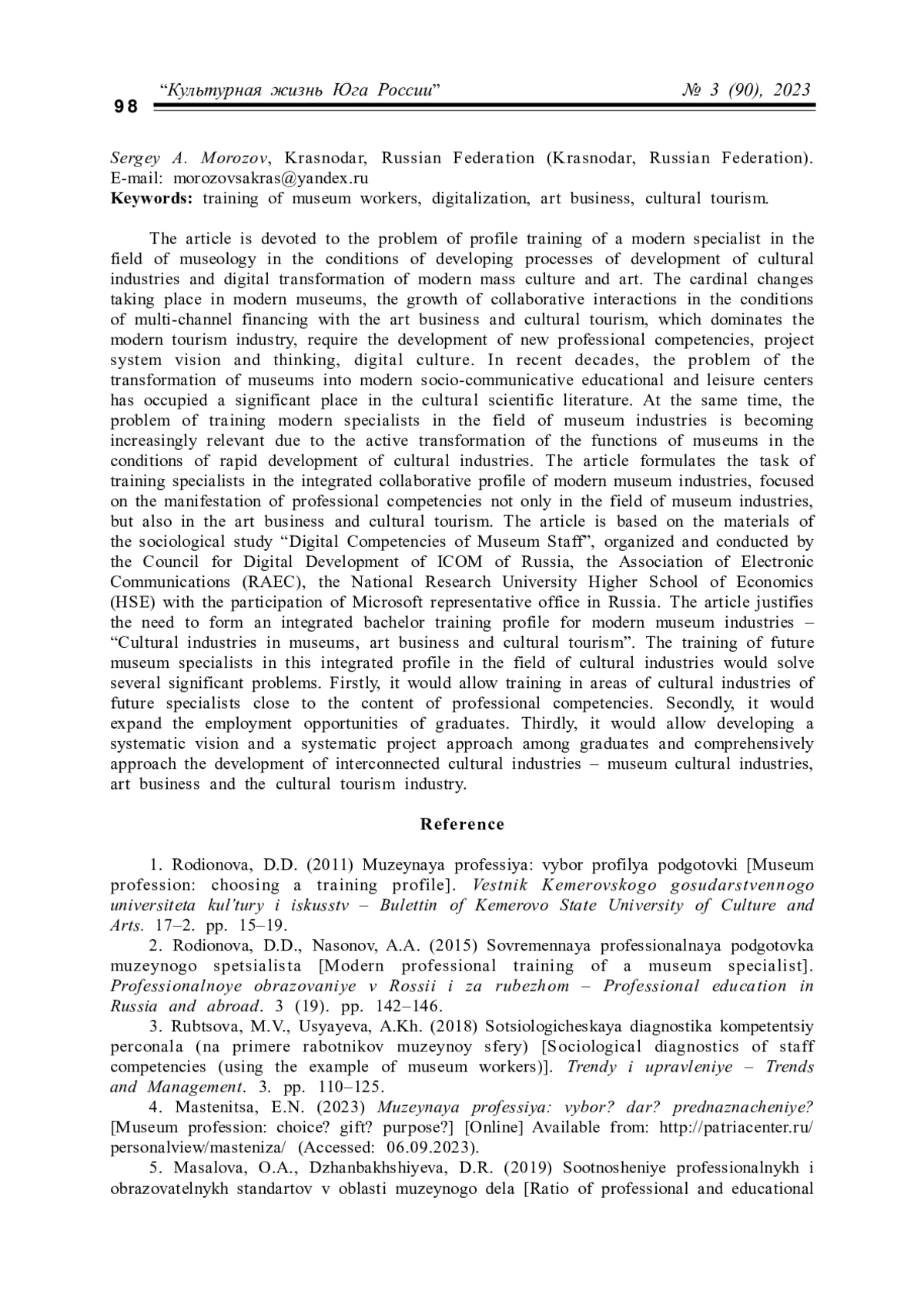 1. Родионова Д.Д. Музейная профессия: выбор профиля подготовки // Вестник Кемеровского государственного университета культуры и искусств. 2011. № 17-2. С. 15-19. EDN: OWJVHV