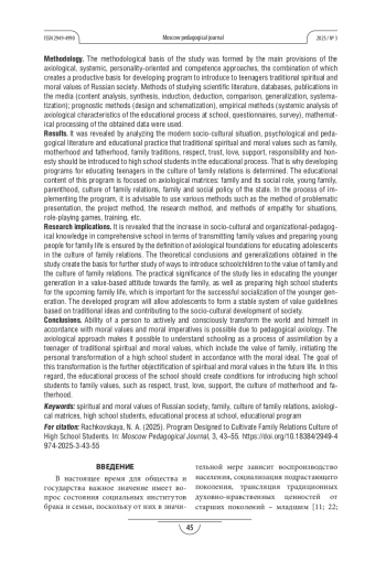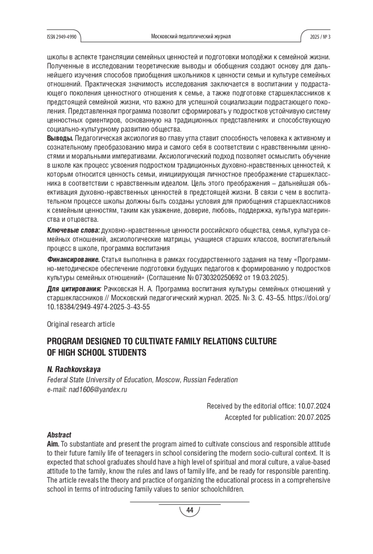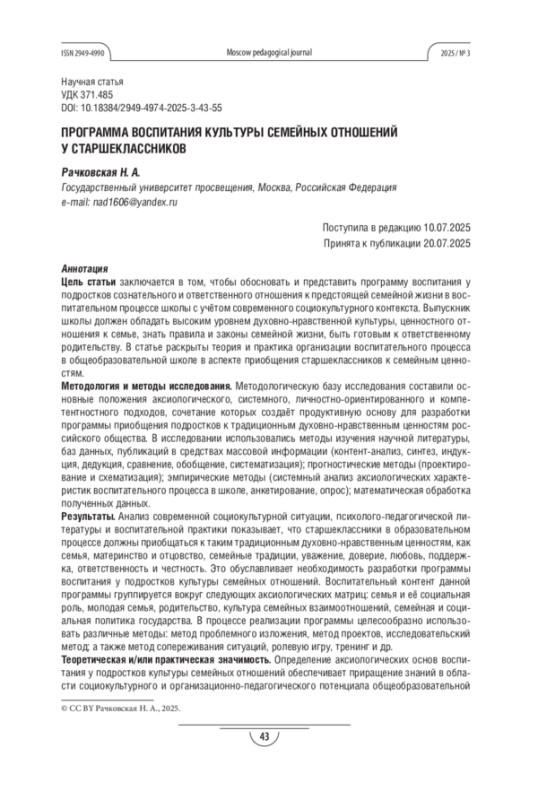 РАЧКОВСКАЯ Н. А. ПРОГРАММА ВОСПИТАНИЯ КУЛЬТУРЫ СЕМЕЙНЫХ ОТНОШЕНИЙ У СТАРШЕКЛАССНИКОВ // МОСКОВСКИЙ ПЕДАГОГИЧЕСКИЙ ЖУРНАЛ. 2025. № 3