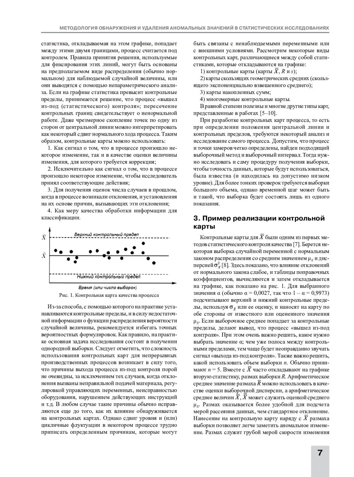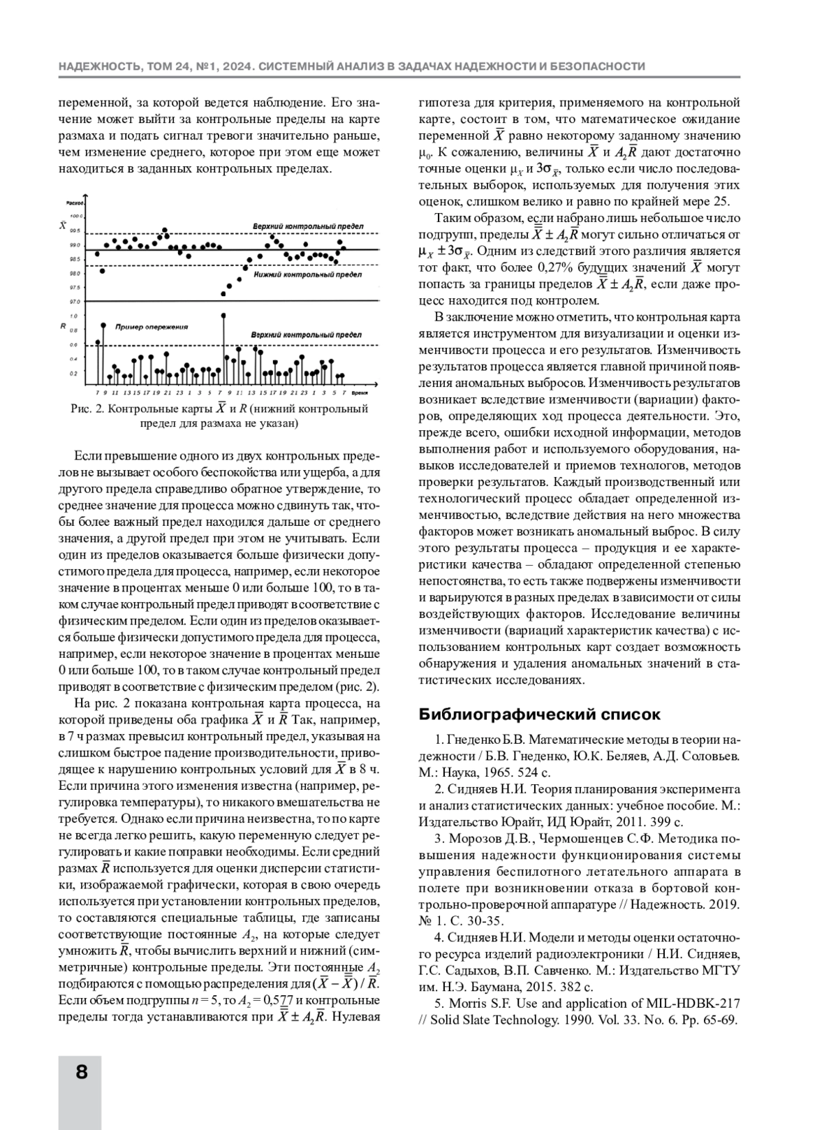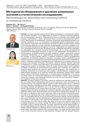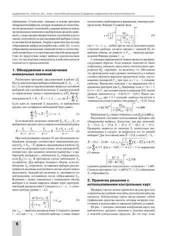 В статье приведена расчетная методика обнаружения и исключения аномальных значений. Показано, что ее эффективность зависит от объема априорной информации об исследуемом процессе. Предложенный метод использован для случаев, когда процесс стационарный и имеет гауссовский закон плотности распределения вероятности. При анализе нестационарных случайных процессов существующие методы и алгоритмы опираются на то, что аномальная составляющая является аддитивной и априорно известны характеристики аномальных значений. В работе использовалась теория статистических решений, которая позволяет формализовать алгоритмы проверок и выбрать критерий обнаружения аномальных значений. Предложены как параметрические, так и непараметрические методы. В первом случае необходимо располагать априорными сведениями как о функции полезной составляющей, так и о законе распределения аномальной составляющей процесса, а также и о его параметрах. Постулируется, что использование непараметрических методов обработки требует значительно меньше априорной информации, но их эффективность определяется параметрами обработки, которые, в свою очередь, зависят от функции полезной и закона распределения аномальной составляющих процесса. Отмечено, что выброс может в действительности оказаться одним из экстремальных значений распределения вероятности случайной величины. Изложены проблемы неопределенности информации по входным данным при расчетах классическими методами. Исследован характер влияния внешних факторов на надежность и степень учета факторов в существующих методах. Представлены методики оценки ресурса исследуемых объектов, среди которых важное место занимают методики, основанные на использовании контрольных карт. Показано, что размах оказывается более удобной для подсчета мерой рассеяния данных, чем стандартное отклонение. Нанесение на контрольную карту наряду с математическим ожиданием размаха выборки позволяет легче заметить аномальное изменение. Размах служит грубой мерой скорости изменения переменной, за которой ведется наблюдение, и его значение может выйти за контрольные пределы на карте размаха и подать сигнал аномалии значительно раньше, чем изменение среднего, которое при этом еще может находиться в заданных контрольных пределах.