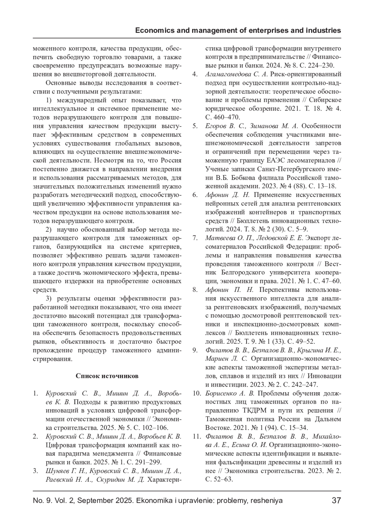 1. Куровский С. В., Мишин Д. А., Воробьев К. В. Подходы к развитию продуктовых инноваций в условиях цифровой трансформации отечественной экономики // Экономика строительства. 2025. № 5. С. 102-106. EDN: OAYFYO