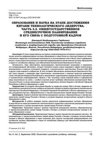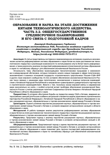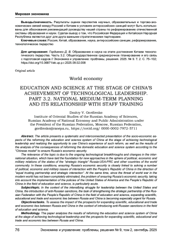 В статье представлены системное и взаимосвязанное изложение социально-экономических аспектов реформирования системы образования и науки Китая на этапе достижения им технологического лидерства и реализации возможности по использованию опыта Китая такого реформирования, а также результаты анализа последствий реформирования отечественной системы образования и науки по «китайскому образцу» для обеспечения экономической безопасности России.