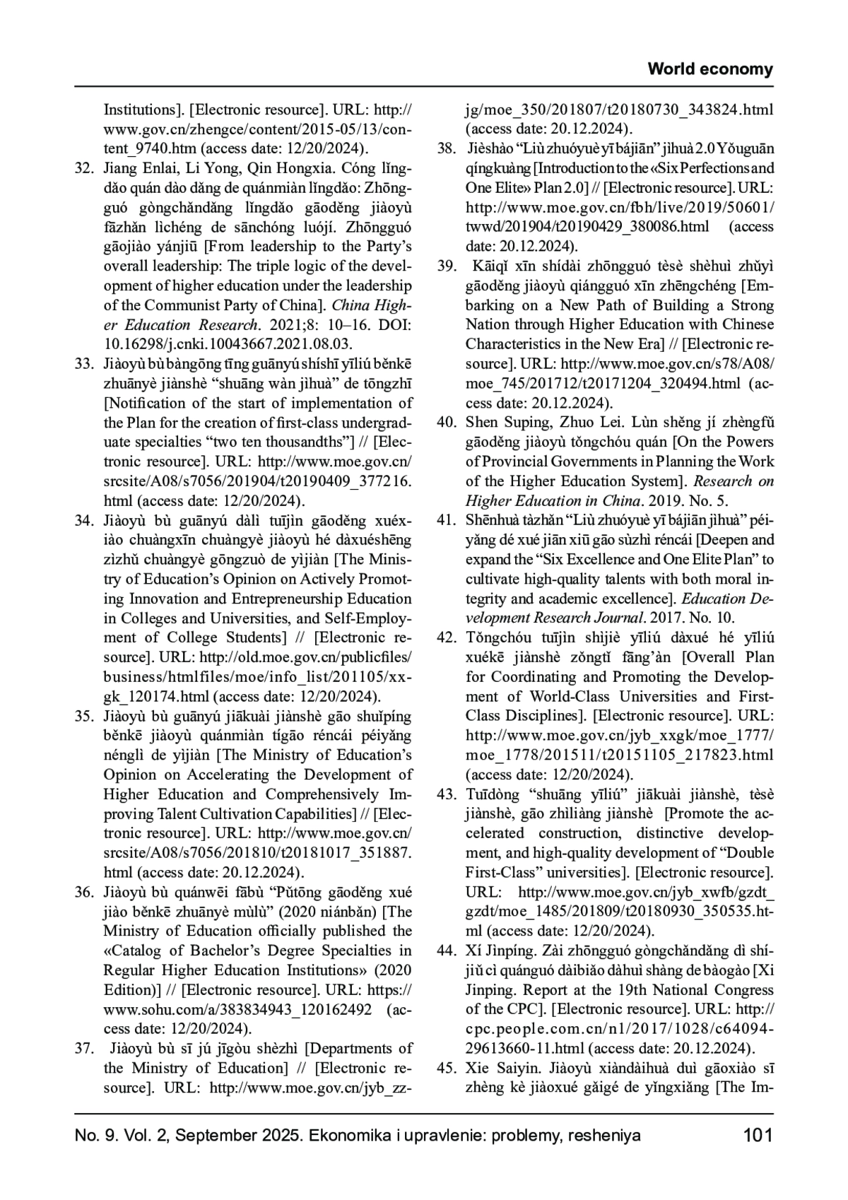 18. Пироженко Л. В., Ван Синсинь Высшее образование в Китае: современное состояние и основные направления развития до 2035 г. [Электронный ресурс]. URL: https://elib.bsu.by/bitstream/123456789/285487/1/43-49.pdf (дата обращения: 20.03.2025).