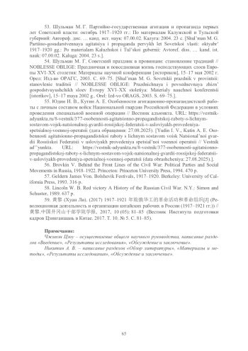 59. 黄黎 (Хуан Ли). (2017) 1917-1921 年旅俄华工的革命活动和革命组织[J] (Революционная деятельность и организации китайских рабочих в России (1917-1921 гг.)) // 黄黎.中国井冈山干部学院学报, 2017, 10 (05): 81-85 (Вестник Института подготовки кадров Цзинганшань в Китае. 2017. Т. 10. № 5. С. 81-85).