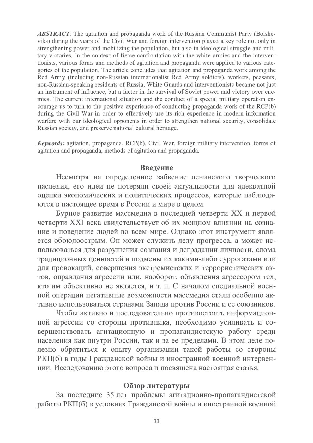 Агитационно-пропагандистская работа Российской коммунистической партии (большевиков) в годы Гражданской войны и иностранной интервенции играла ключевую роль не только в укреплении власти и мобилизации населения, но и в идеологической борьбе и военных победах. В условиях ожесточенного противостояния с белыми армиями и интервентами к различным категориям населения применялись разные формы и методы агитации и пропаганды. Делается вывод, что агитационно-пропагандистская работа среди красноармейцев (включая нерусских красноармейцев-интернационалистов), рабочих, крестьян, не русскоязычных жителей России, белогвардейцев и интервентов стала не просто инструментом влияния, а фактором выживания советской власти и победы над врагами. Современная международная обстановка, проведение специальной военной операции побуждают нас обращаться к положительной практике ведения агитационно-пропагандистской работы РКП(б) в период Гражданской войны, чтобы эффективно использовать ее богатый опыт в современной информационной войне с нашими идейными противниками в целях укрепления национальной безопасности, консолидации российского общества, сохранения национального культурного наследия.