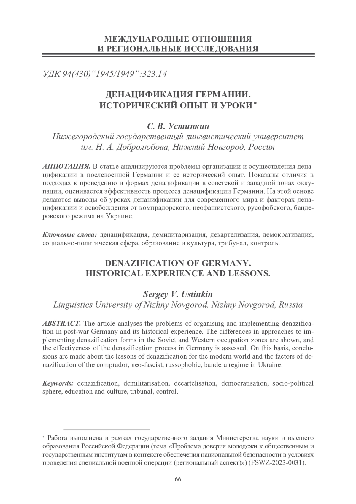 В статье анализируются проблемы организации и осуществления денацификации в послевоенной Германии и ее исторический опыт. Показаны отличия в подходах к проведению и формах денацификации в советской и западной зонах оккупации, оценивается эффективность процесса денацификации Германии. На этой основе делаются выводы об уроках денацификации для современного мира и факторах денацификации и освобождения от компрадорского, неофашистского, русофобского, бандеровского режима на Украине.
