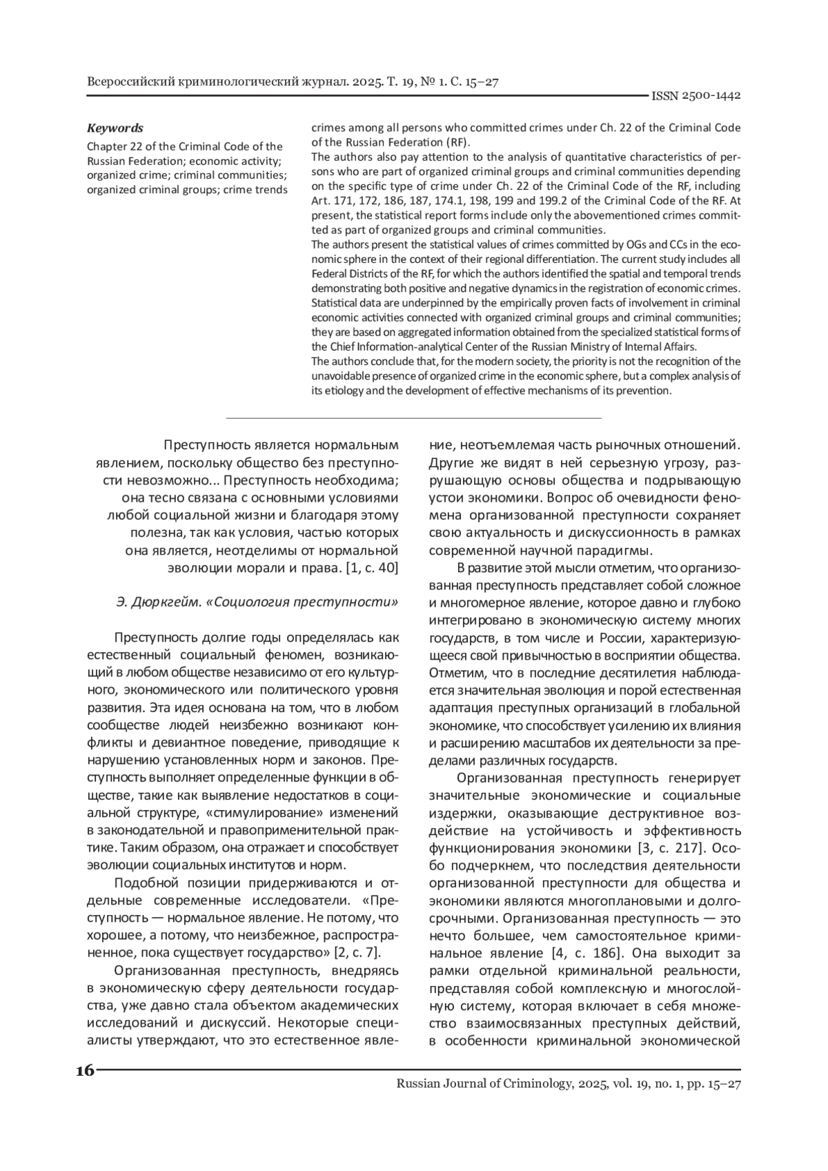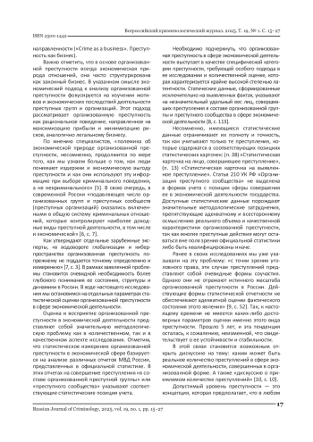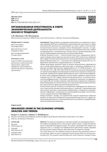 Предлагаемое исследование фокусируется на имманентно присущей современной России проблематике организованной преступности в сфере экономической деятельности, рассматривая ее сквозь призму статистико-криминологического анализа. Авторами статьи обосновывается мнение, что организованная преступность является сложным и многомерным явлением, глубоко интегрированным в экономическую систему России, детерминирующую длительно сохраняющийся характер этого негативного феномена. В фокусе внимания статьи - статистический анализ лиц, совершивших преступления в форме организованных преступных групп (ОГ) и преступных сообществ (ПС) в сфере экономической деятельности. В исследовательском материале продемонстрирована доля лиц - участников этих преступлений среди всех лиц, совершивших преступления, предусмотренных гл. 22 УК РФ. Авторы акцентируют внимание также на анализе количественных характеристик лиц в составе организованных преступных групп и преступных сообществ по отдельным составам преступлений, предусмотренных гл. 22 УК РФ, включая ст. 171, 172, 186, 187, 174.1, 198, 199 и 199.2 УК РФ. По состоянию на данный период времени статистические формы учета фиксируют исключительно указанные составы преступлений, совершенные в форме организованных групп и преступных сообществ. В статье также продемонстрировано статистическое измерение преступлений, совершенных ОГ и ПС в сфере экономической деятельности, в контексте региональной дифференциации. Настоящее исследование охватывает все федеральные округа РФ, для которых выявлены пространственно-временные тенденции, демонстрирующие как положительную, так и отрицательную динамику регистрации преступлений в сфере экономической деятельности. Статистические данные основаны на эмпирически подтвержденных фактах участия в преступной экономической деятельности, связанной с организованными преступными группами и преступными сообществами, и опираются на агрегированную информацию, полученную из специализированных форм статистического учета, предоставленных ГИАЦ МВД России. Авторы приходят к выводу, что приоритетной задачей современного общества является не признание неизбежности организованной преступности в сфере экономической деятельности, а комплексный анализ ее этиологии и разработка действенных механизмов превенции.