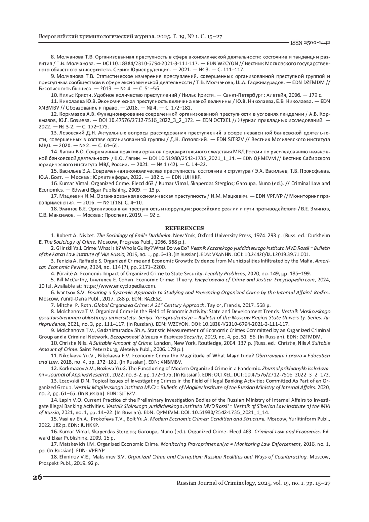 8. Молчанова Т.В. Организованная преступность в сфере экономической деятельности: состояние и тенденции развития / Т.В. Молчанова. // Вестник Московского государственного областного университета. Серия: Юриспруденция. - 2021. - № 3. - С. 111-117. DOI: 10.18384/2310-6794-2021-3-111-117 EDN: WZCYON