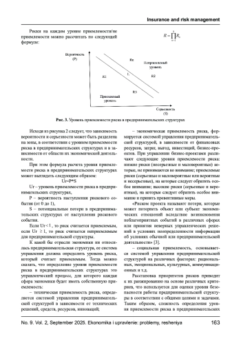 В статье обоснован процесс оценки уровня приемлемости риска в предпринимательских структурах. Выявлено, что концепция приемлемости риска имеет важное значение в развитии предпринимательских структур и используется системами управления на стратегическом уровне. Научная новизна и практическая значимость работы заключается в разработке системного подхода к определению линии приемлемости, в которой предельное значение риска определяется исходя из вероятности его возникновения и последствий в течение анализируемого периода времени. Выведена формула расчета уровня приемлемости риска в предпринимательских структурах на основании вероятности наступления рискового события и потенциальных потерь от него.