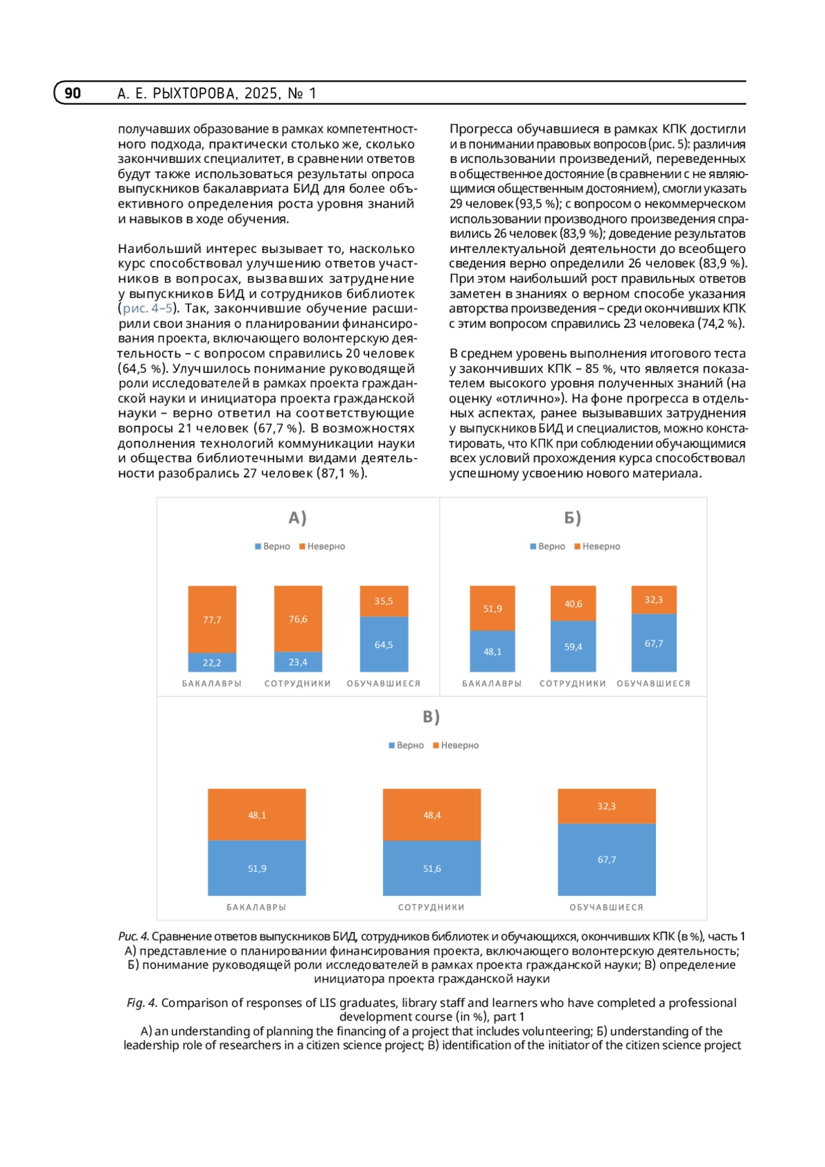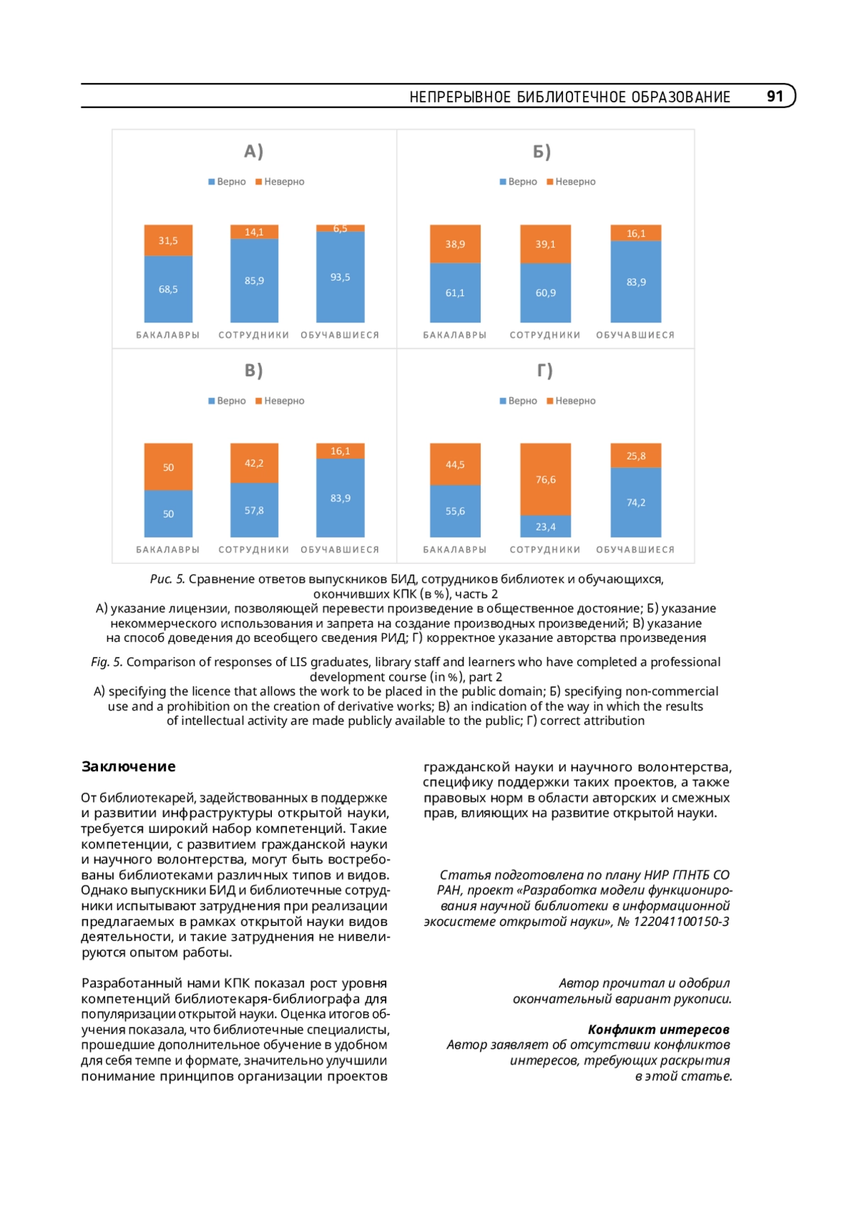 С достижением цели было связано две задачи: 1) уточнение уровня подготовленности библиотечных специалистов к популяризации открытой науки, 2) определение целесообразности курса путем сравнения уровня подготовки библиотечных специалистов и специалистов, окончивших обучение по программе повышения квалификации. На основании тестирования выпускников 4 курса бакалавриата библиотечно-информационной деятельности 11 вузов России, а также завершенного в декабре 2024 г. тестирования работающих в библиотеках специалистов было определено, что библиотечные специалисты испытывают сложности с организацией деятельности в рамках гражданской науки и при соблюдении действующих правовых норм в области авторских и смежных прав. Разработанный с целью закрыть лакуны в знаниях библиотечных специалистов КПК «Библиотекарь- библиограф – инструктор открытой науки» по результатам анализа итогового тестирования обучающихся и сравнения его итогов с полученными данными показал повышение уровня необходимых библиотекарю- библиографу компетенций для популяризации открытой науки.