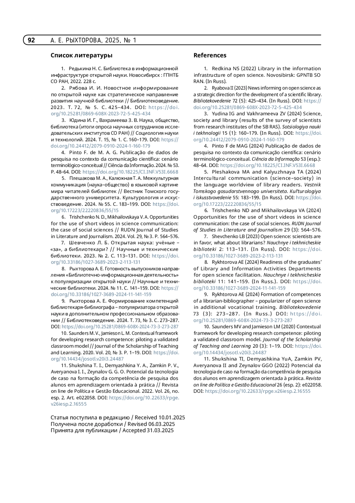 8. Рыхторова А. Е. Готовность выпускников направления «Библиотечно-информационная деятельность» к популяризации открытой науки // Научные и технические библиотеки. 2024. № 11. С. 141-159. https://doi.org/10.33186/1027-3689-2024-11-141-159
