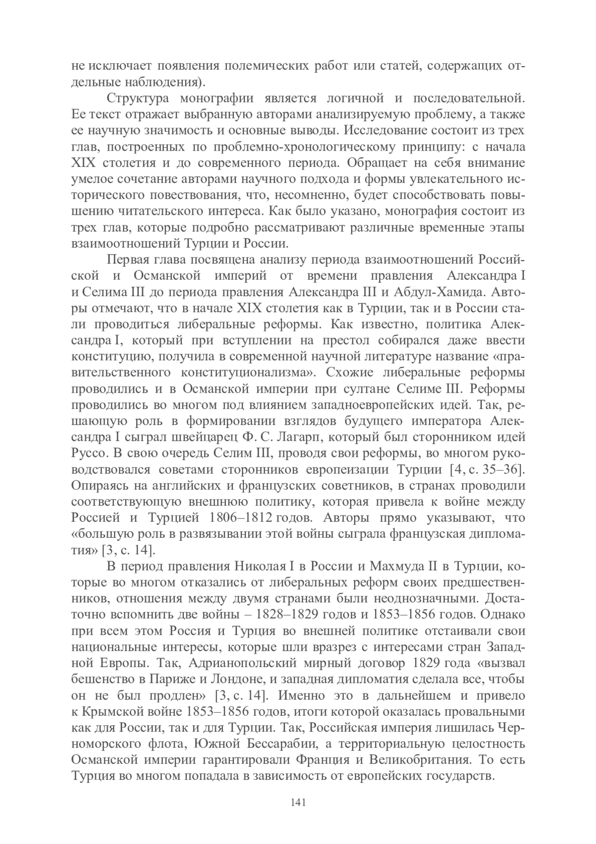 Структура монографии является логичной и последовательной. Ее текст отражает выбранную авторами анализируемую проблему, а также ее научную значимость и основные выводы. Исследование состоит из трех глав, построенных по проблемно-хронологическому принципу: с начала XIX столетия и до современного периода. Обращает на себя внимание умелое сочетание авторами научного подхода и формы увлекательного исторического повествования, что, несомненно, будет способствовать повышению читательского интереса. Как было указано, монография состоит из трех глав, которые подробно рассматривают различные временные этапы взаимоотношений Турции и России.
