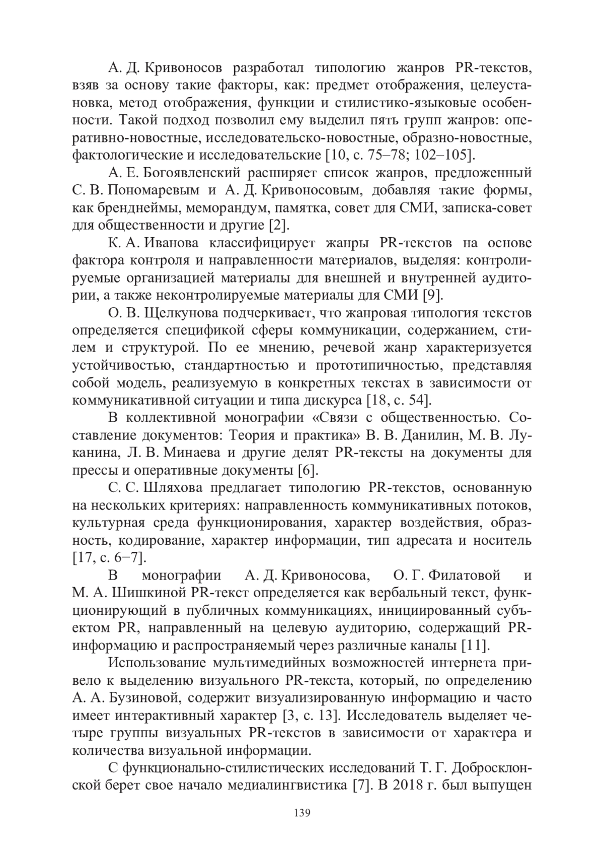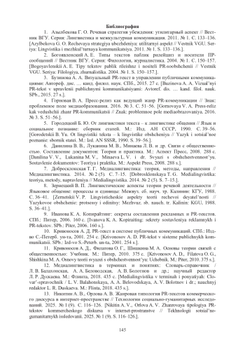 2. Богоявленский А. Е. Типы текстов паблик рилейшнз и носители ПР-сообщений // Вестник ВГУ. Серия: Филология, журналистика. 2004. № 1. С. 150-157.