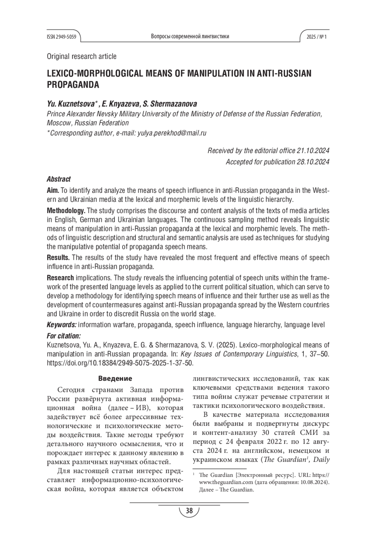 Процедура и методы. В настоящем исследовании использован дискурс и контент-анализ текстов статей СМИ на английском, немецком и украинском языках. Методом сплошной выборки выявлены лексико-морфологические средства манипулирования в антироссийской пропаганде. Методы лингвистического описания и структурно-семантического анализа применяются в качестве приёмов исследования манипулятивного потенциала пропагандистских речевых средств.
