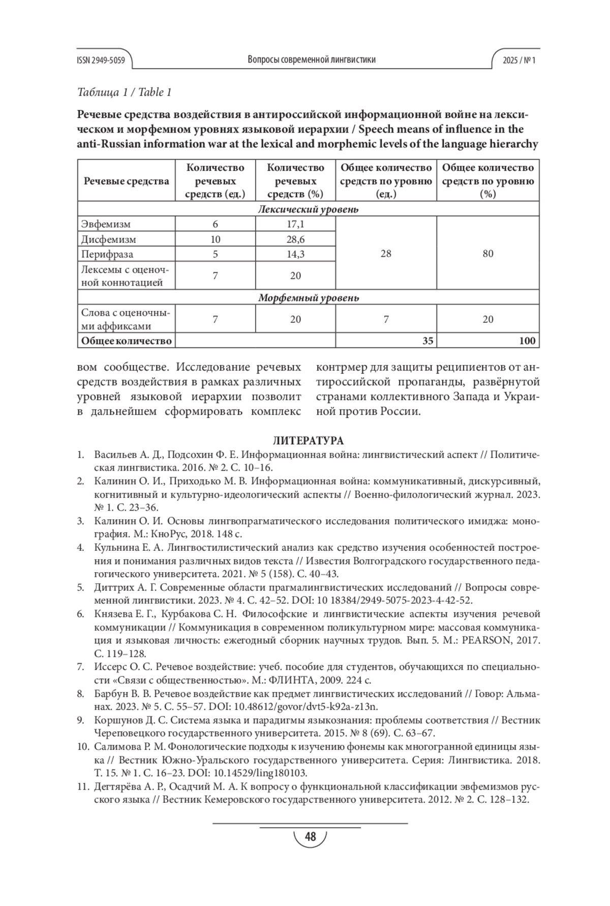 1. Васильев А. Д., Подсохин Ф. Е. Информационная война: лингвистический аспект // Политическая лингвистика. 2016. № 2. С. 10-16. EDN: WDNOUH