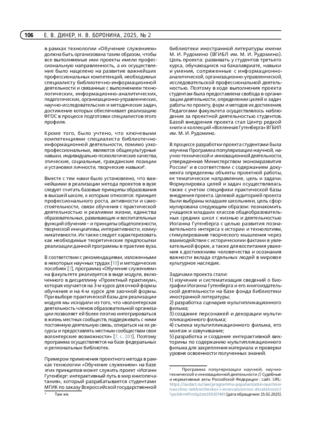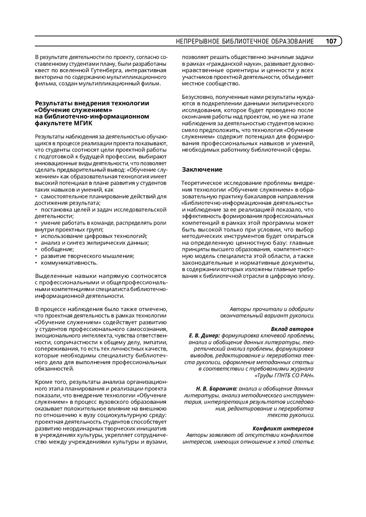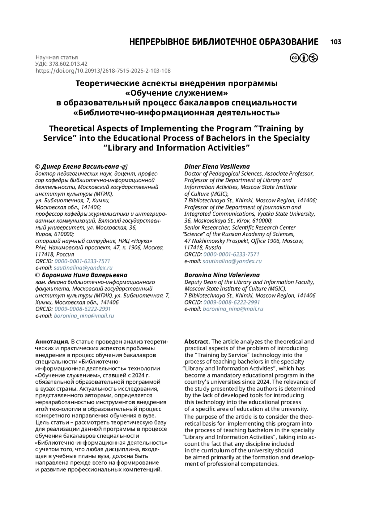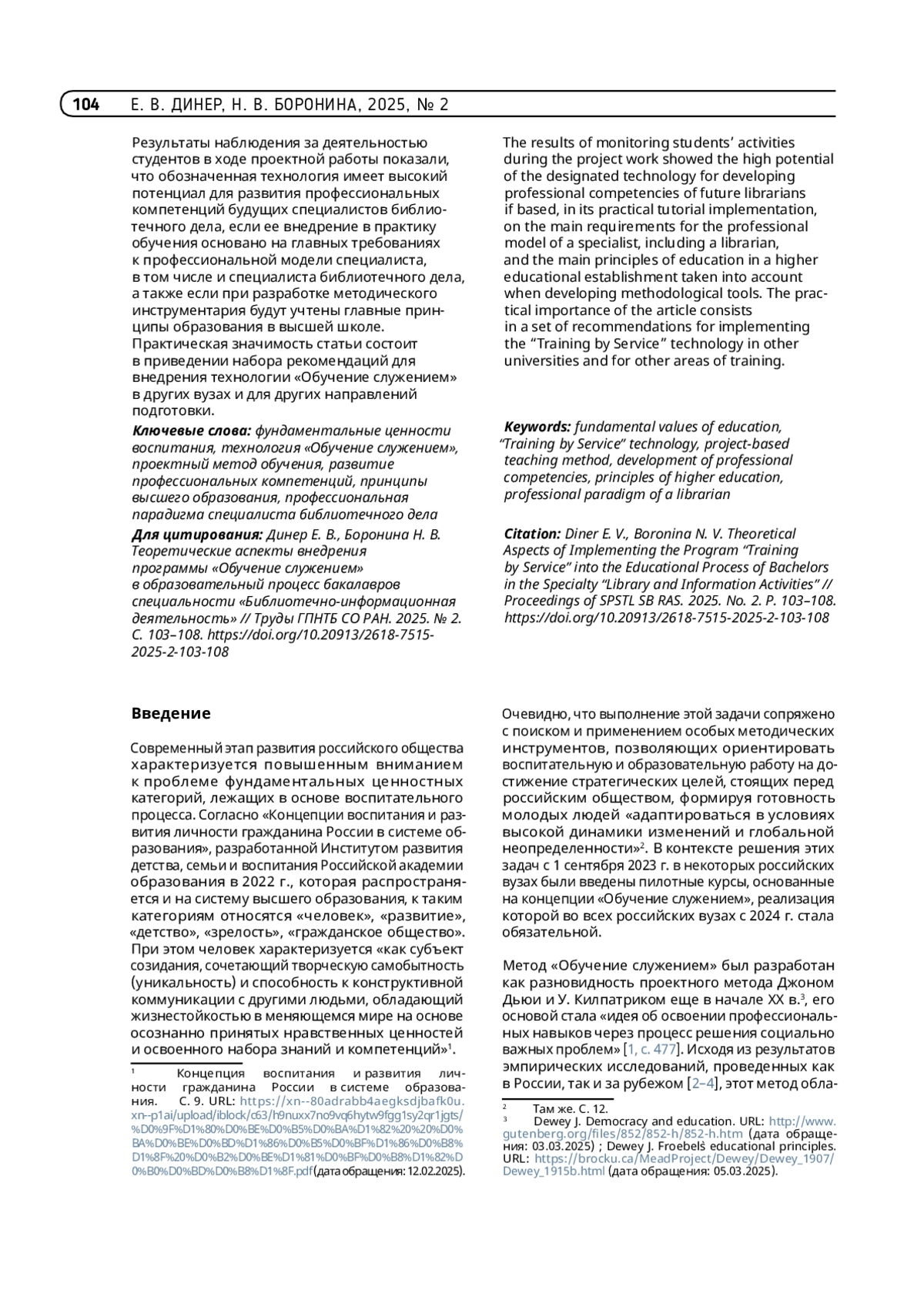 ДИНЕР Е. В., БОРОНИНА Н. В. ТЕОРЕТИЧЕСКИЕ АСПЕКТЫ ВНЕДРЕНИЯ ПРОГРАММЫ «ОБУЧЕНИЕ СЛУЖЕНИЕМ» В ОБРАЗОВАТЕЛЬНЫЙ ПРОЦЕСС БАКАЛАВРОВ СПЕЦИАЛЬНОСТИ «БИБЛИОТЕЧНО-ИНФОРМАЦИОННАЯ ДЕЯТЕЛЬНОСТЬ» // ТРУДЫ ГПНТБ СО РАН. 2025. № 2
