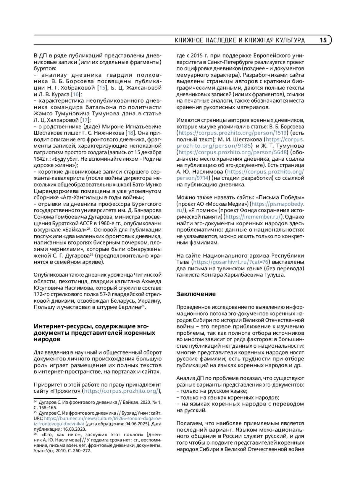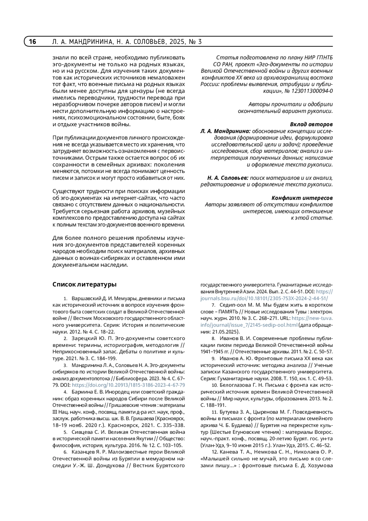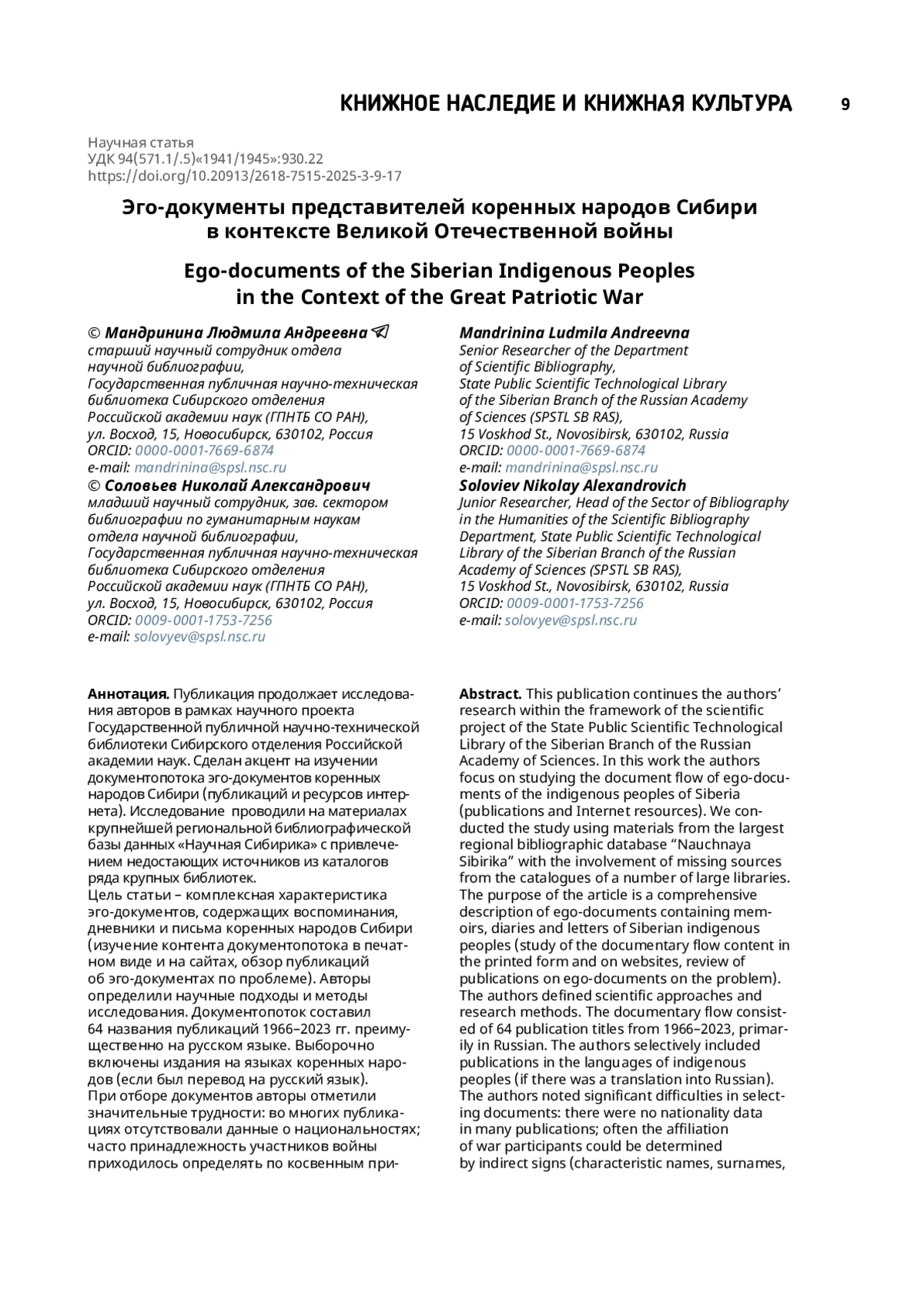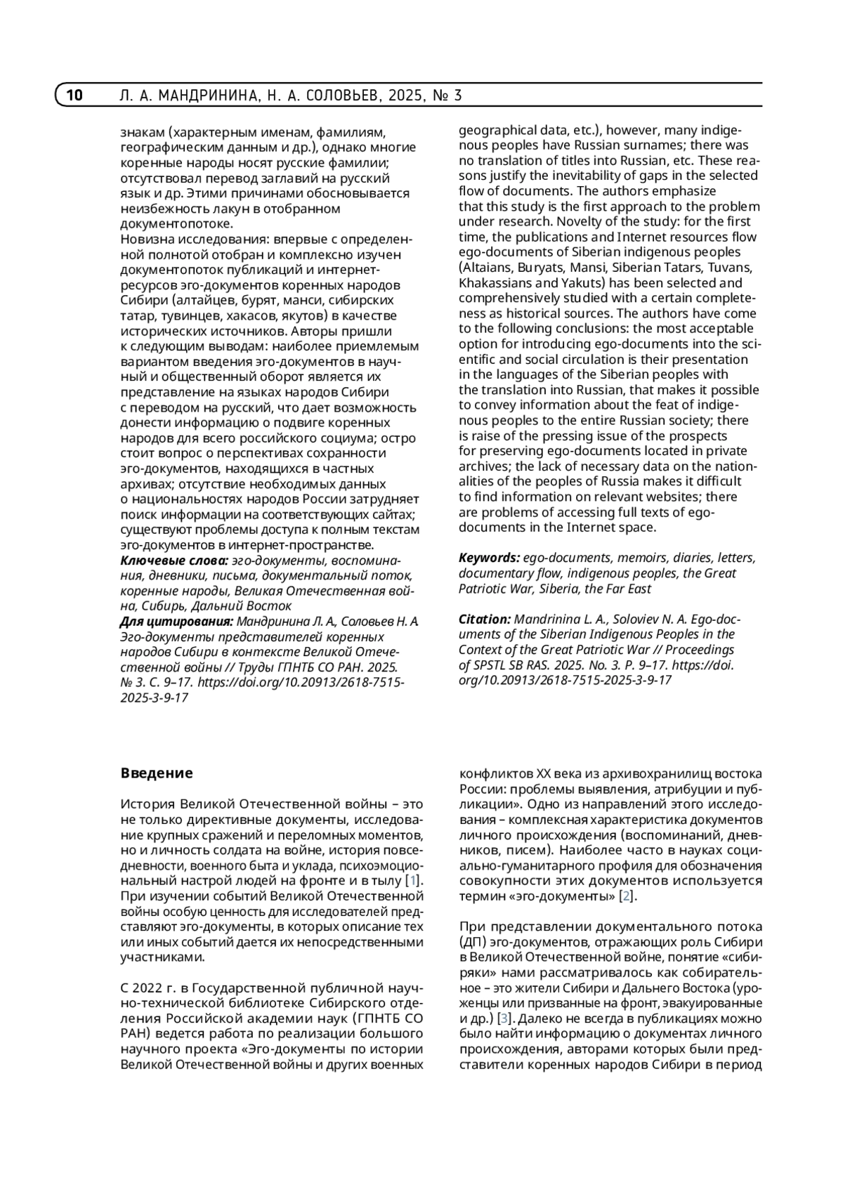 МАНДРИНИНА Л. А., СОЛОВЬЕВ Н. А. ЭГО-ДОКУМЕНТЫ ПРЕДСТАВИТЕЛЕЙ КОРЕННЫХ НАРОДОВ СИБИРИ В КОНТЕКСТЕ ВЕЛИКОЙ ОТЕЧЕСТВЕННОЙ ВОЙНЫ // ТРУДЫ ГПНТБ СО РАН. 2025. № 3