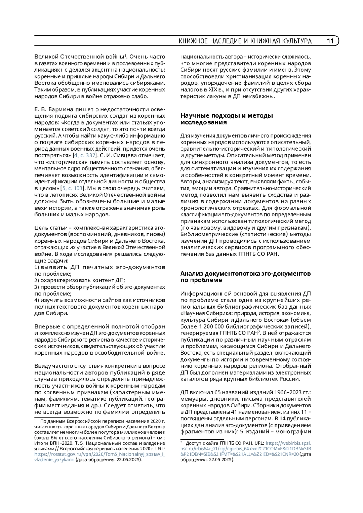 Публикация продолжает исследования авторов в рамках научного проекта Государственной публичной научно-технической библиотеки Сибирского отделения Российской академии наук. Сделан акцент на изучении документопотока эго-документов коренных народов Сибири (публикаций и ресурсов интернета). Исследование проводили на материалах крупнейшей региональной библиографической базы данных «Научная Сибирика» с привлечением недостающих источников из каталогов ряда крупных библиотек.