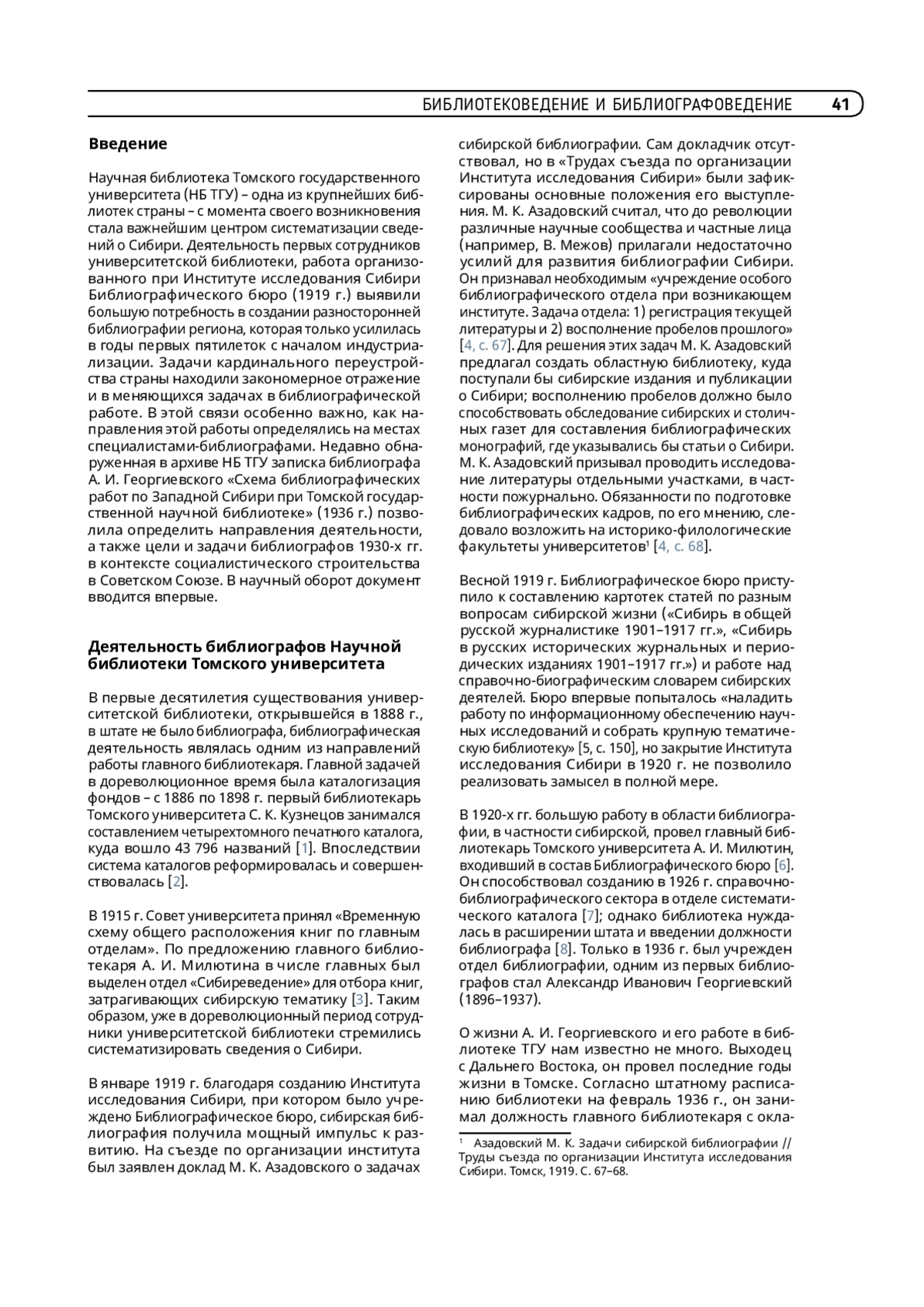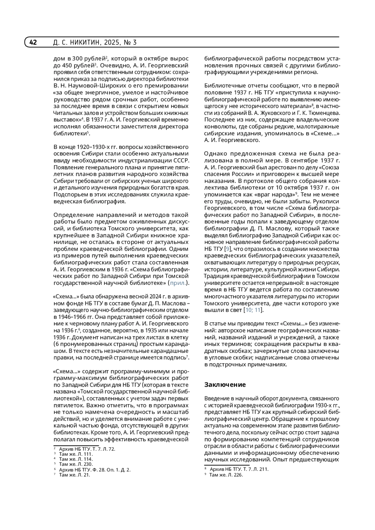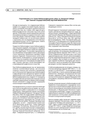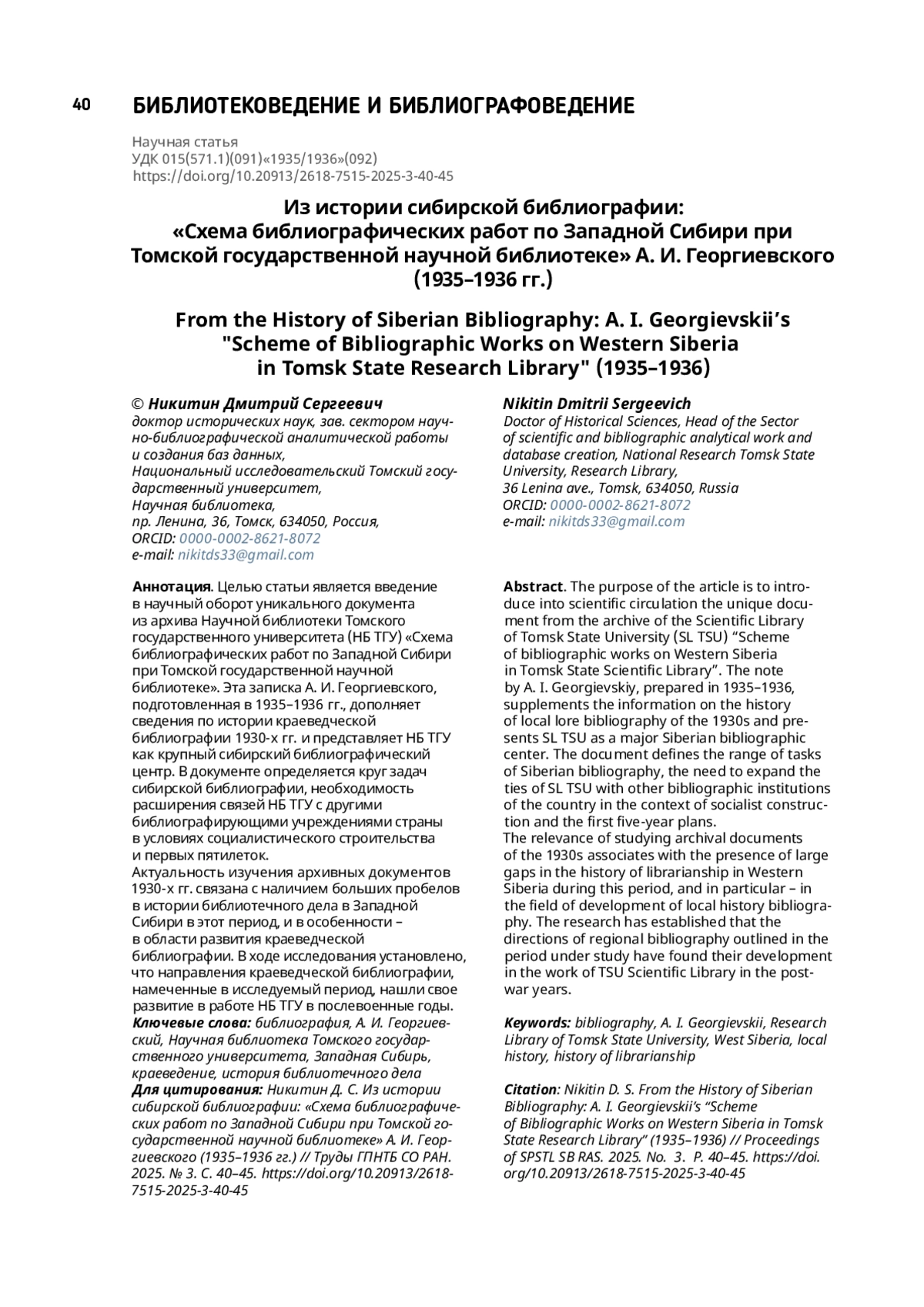 НИКИТИН Д. С. ИЗ ИСТОРИИ СИБИРСКОЙ БИБЛИОГРАФИИ: «СХЕМА БИБЛИОГРАФИЧЕСКИХ РАБОТ ПО ЗАПАДНОЙ СИБИРИ ПРИ ТОМСКОЙ ГОСУДАРСТВЕННОЙ НАУЧНОЙ БИБЛИОТЕКЕ» А. И. ГЕОРГИЕВСКОГО (1935–1936 ГГ.) // ТРУДЫ ГПНТБ СО РАН. 2025. № 3