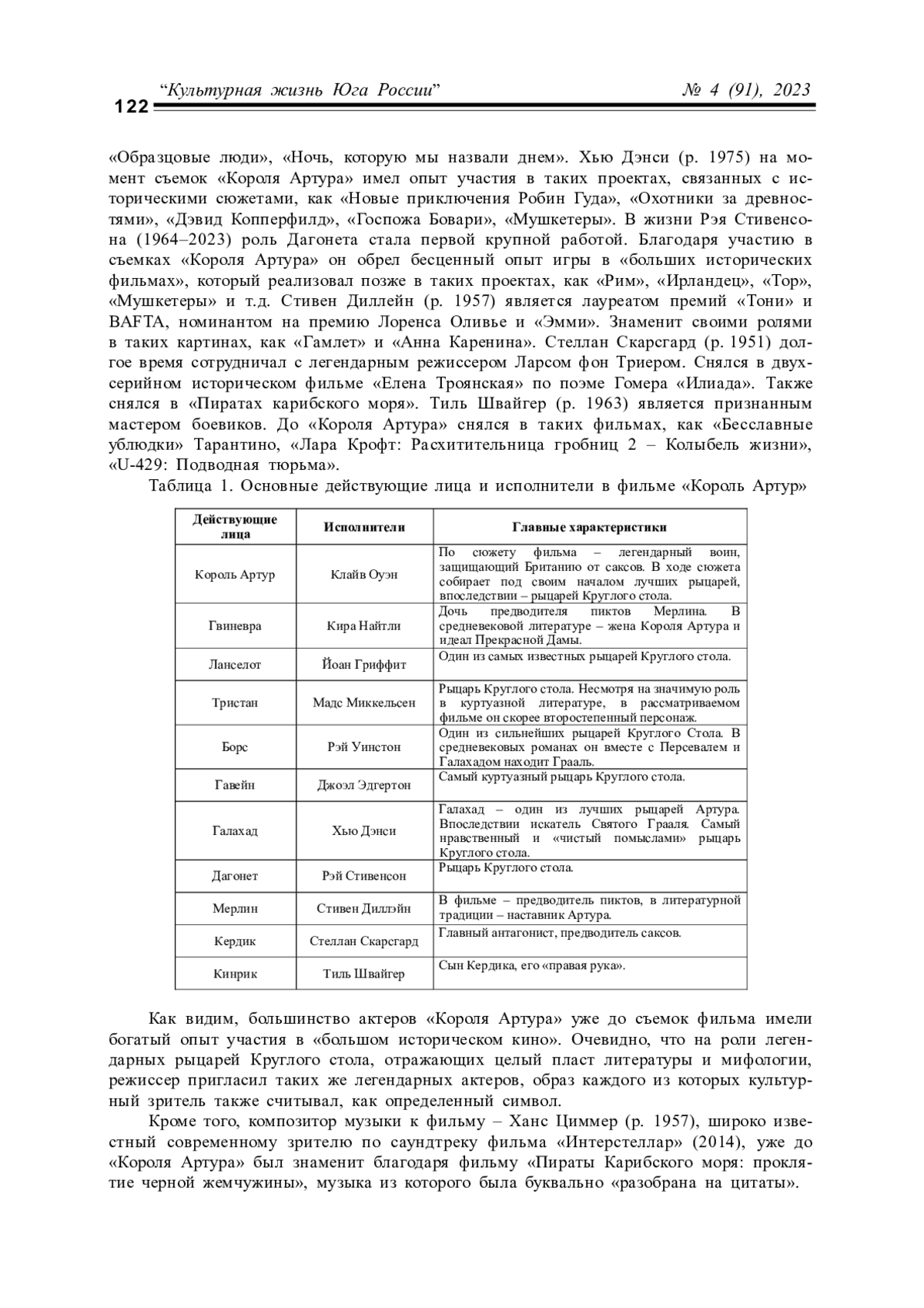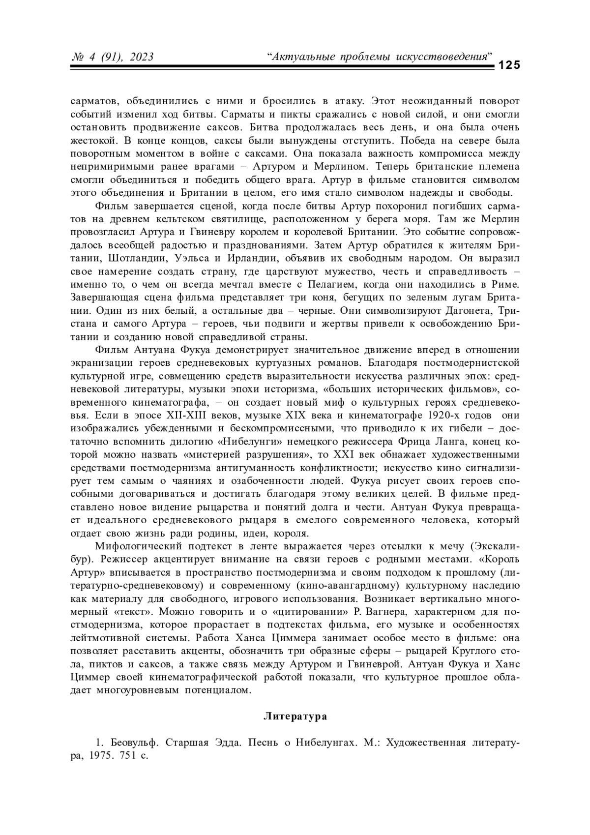 Интерес к культурным героям средневековья ныне переживает масштабный взлет. Режиссеры XXI века решают сверхзадачи их приближения к массовой аудитории. Научная новизна статьи определяется выявлением путей, способов, механизмов и стилистических рамок актуализации средневекового материала. Использованы контекстный подход, герменевтический и образно-стилистический методы. Автор статьи приходит к выводам, что фильм «Король Артур» вписывается в пространство постмодернизма, в нем представлено новое видение рыцарства, понятий долга и чести. Музыка Ханса Циммера позволяет расставить акценты, обозначить образные сферы, связи между героями. Антуан Фукуа и Ханс Циммер показали, что культурное прошлое обладает многоуровневым потенциалом воздействия на настоящее средствами искусства