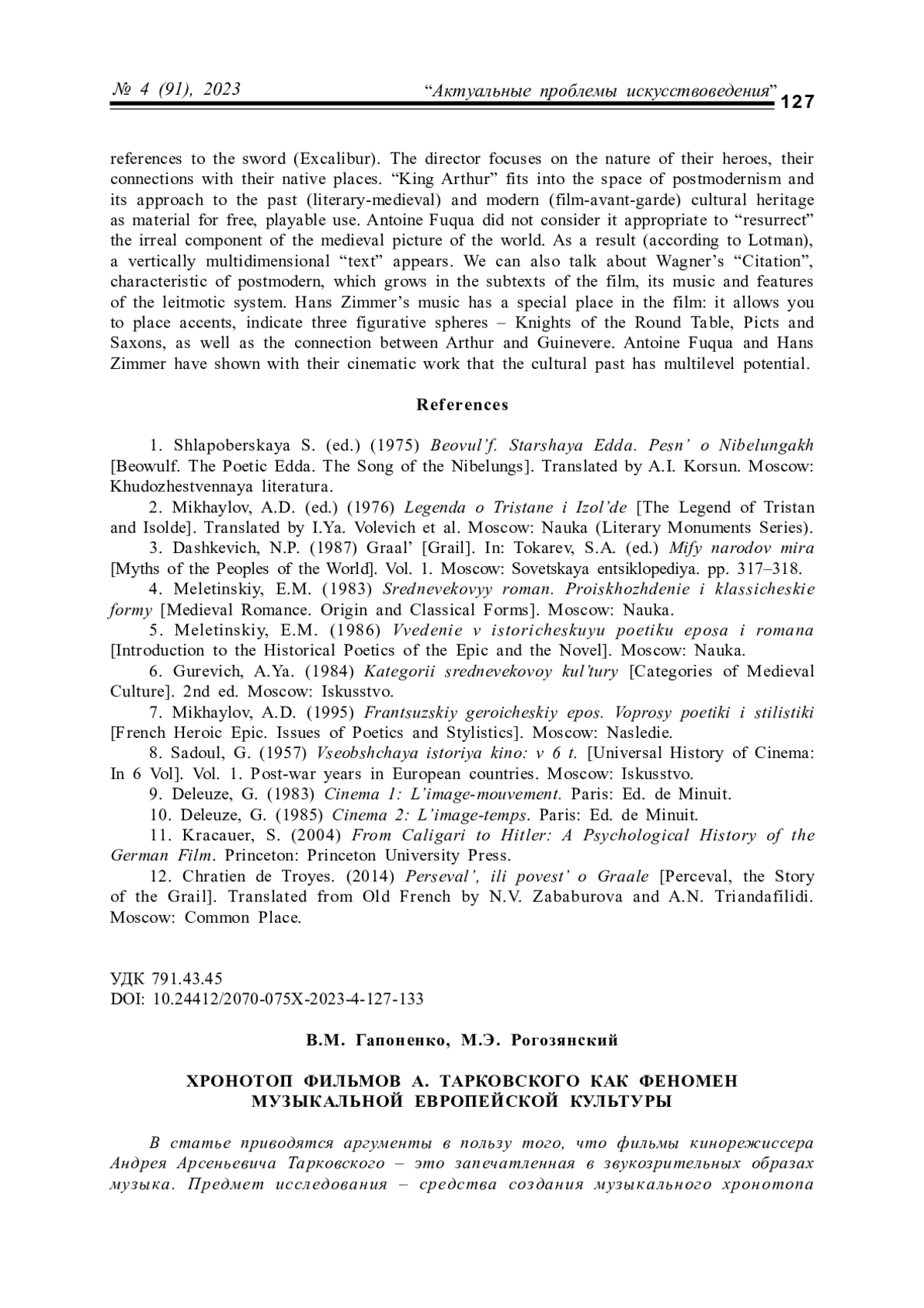 В статье приводятся аргументы в пользу того, что фильмы кинорежиссера Андрея Арсеньевича Тарковского – это запечатленная в звукозрительных образах музыка. Предмет исследования – средства создания музыкального хронотопа фильмов А. Тарковского – рассматривается с позиции цивилизационной теории. Авторы приходят к выводу, что творчество режиссера снимает ряд противоречий во взаимодействии русской и западноевропейской цивилизаций, имеющих общий фундамент. Творчество Тарковского христоцентрично, и этот стержень во многом проявляется именно через музыку. Хронотоп фильмов Тарковского, по мнению авторов, является феноменом музыкальной европейской культуры – общей для России, Восточной и Западной Европы.
