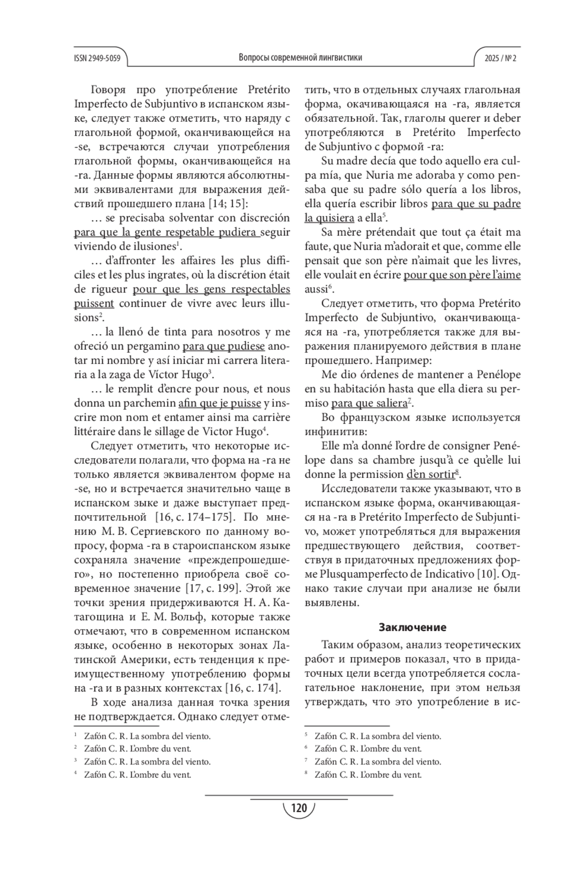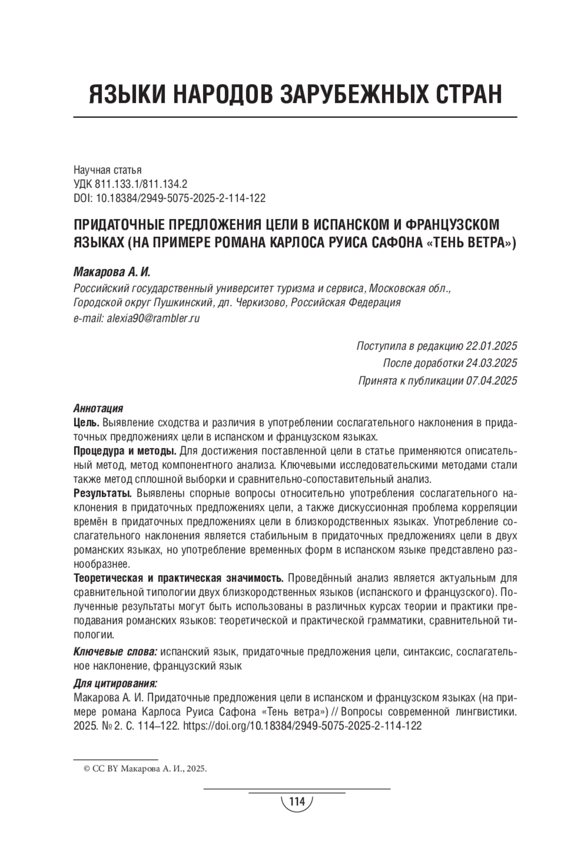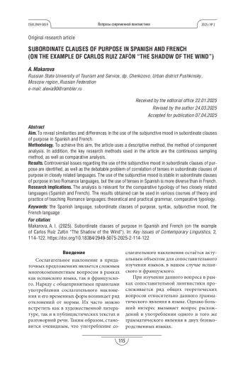 МАКАРОВА А. И. ПРИДАТОЧНЫЕ ПРЕДЛОЖЕНИЯ ЦЕЛИ В ИСПАНСКОМ И ФРАНЦУЗСКОМ ЯЗЫКАХ (НА ПРИМЕРЕ РОМАНА КАРЛОСА РУИСА САФОНА «ТЕНЬ ВЕТРА») // ВОПРОСЫ СОВРЕМЕННОЙ ЛИНГВИСТИКИ. 2025. № 2
