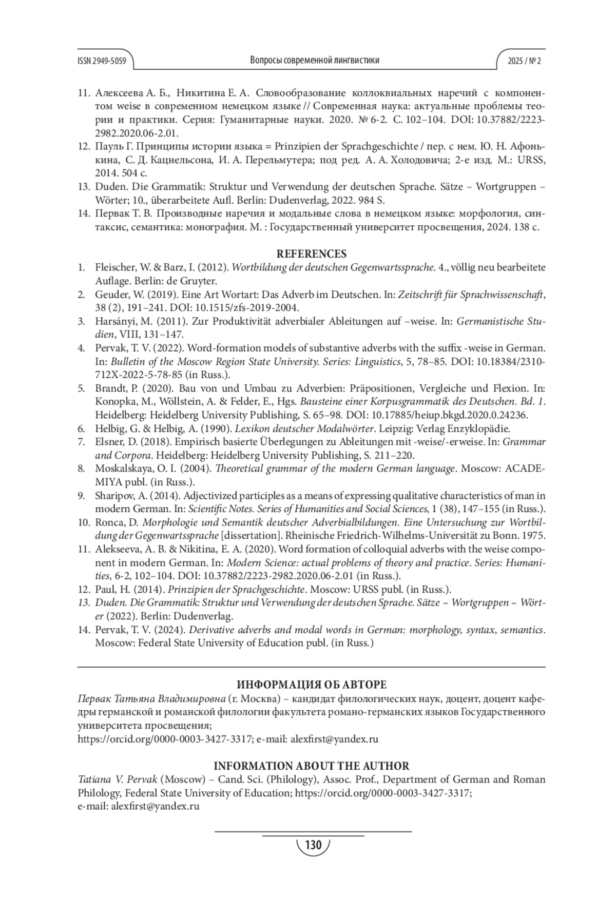 4. Первак Т. В. Словообразовательные модели отсубстантивных наречий с суффиксом -weise в немецком языке // Вестник Московского государственного областного университета. Серия: Лингвистика. 2022. № 5. С. 78-85. DOI: 10.18384/2310-712X-2022-5-78-85 EDN: ASWTRM
