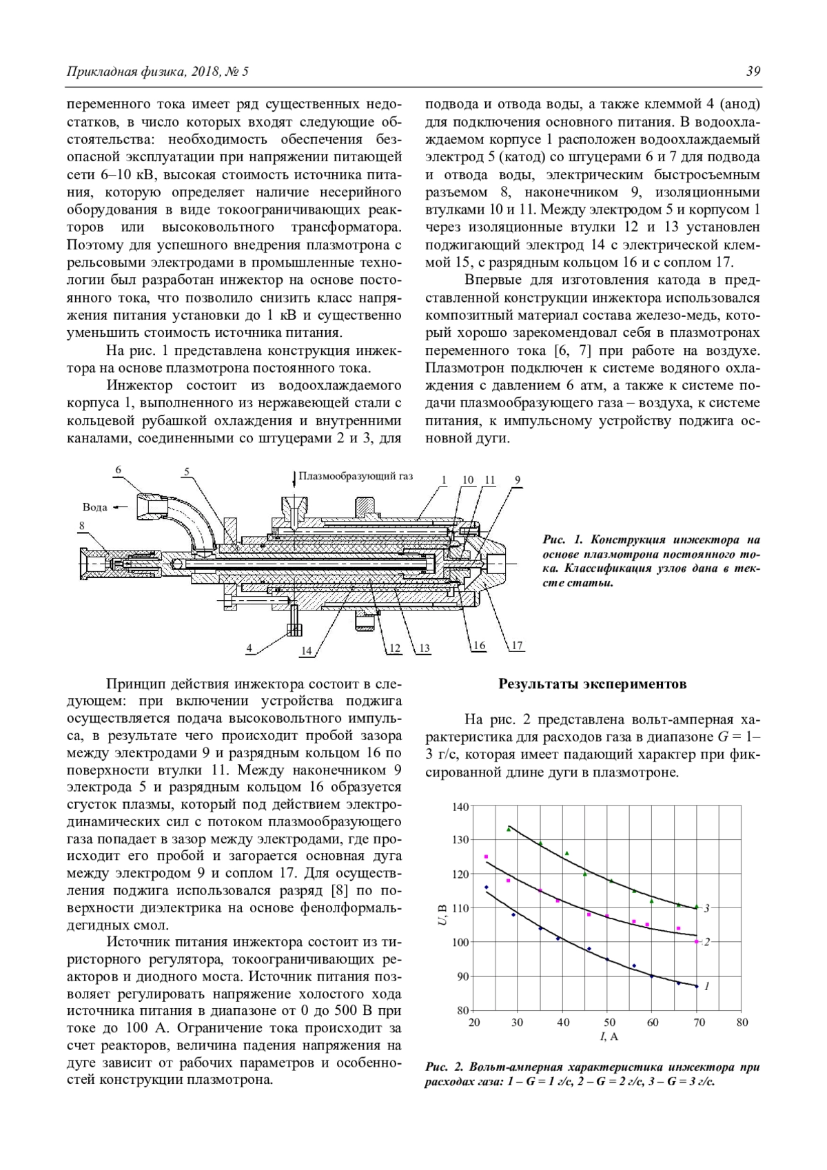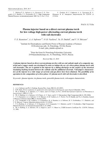 Статья: Инжектор плазмы на базе плазмотрона постоянного тока для низковольтного мощного плазмотрона переменного тока с рельсовыми электродами (2018)