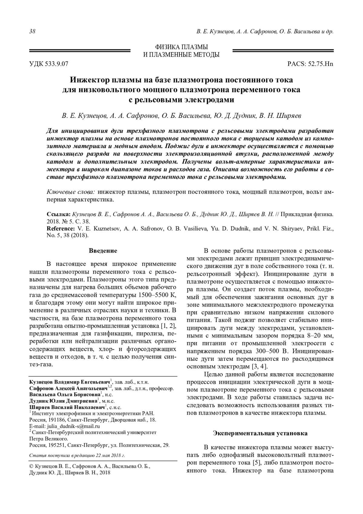 КУЗНЕЦОВ В. Е., САФРОНОВ А. А., ВАСИЛЬЕВА О. Б., ДУДНИК Ю. Д., ШИРЯЕВ В. Н. ИНЖЕКТОР ПЛАЗМЫ НА БАЗЕ ПЛАЗМОТРОНА ПОСТОЯННОГО ТОКА ДЛЯ НИЗКОВОЛЬТНОГО МОЩНОГО ПЛАЗМОТРОНА ПЕРЕМЕННОГО ТОКА С РЕЛЬСОВЫМИ ЭЛЕКТРОДАМИ // ПРИКЛАДНАЯ ФИЗИКА. 2018. №5