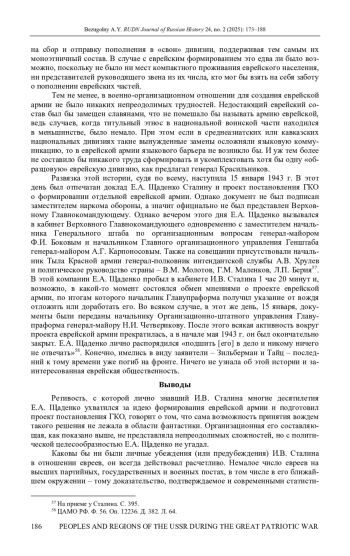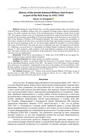 Участие советских евреев в вооруженной борьбе против нацистской Германии в качестве военнослужащих Красной армии до сих пор изучено недостаточно. Одной из любопытных тем является попытка создания еврейских национальных частей для борьбы на советско-германском фронте. В центре анализа в данной статье находится комплекс документов, обнаруженный автором в фонде Главного управления формирования и укомплектования войск (Главупраформа) Красной армии в Центральном архиве Минобороны РФ. На основе этого и других документальных источников рассматривается история нереализованного проекта формирования Отдельной еврейской армии в начале 1943 г.: причины и обстоятельства возникновения общественного запроса на создание еврейской воинской части в начале войны; трансляция этого запроса через обращения инициативных лиц в адрес органов государственной власти и общественных организаций; переадресация обращений воентехника 1-го ранга Г. Л. Зильбермана заместителю наркома обороны Е. А. Щаденко; разработка под руководством Щаденко проекта еврейской армии; анализ реализуемости проекта и обстоятельств его отклонения высшей властью страны. В статье также рассмотрены особенности представленности евреев в Красной армии, их служебного положения и продвижения по службе и отражение их усилий на фронте в советском общественном сознании. Сделан вывод о том, что замысел формирования еврейской армии был вполне реализуем с организационной точки зрения, однако в глазах руководства страны он не имел той политической актуальности, которой обладали иные, осуществляемые в тот же период проекты национальных воинских формирований.