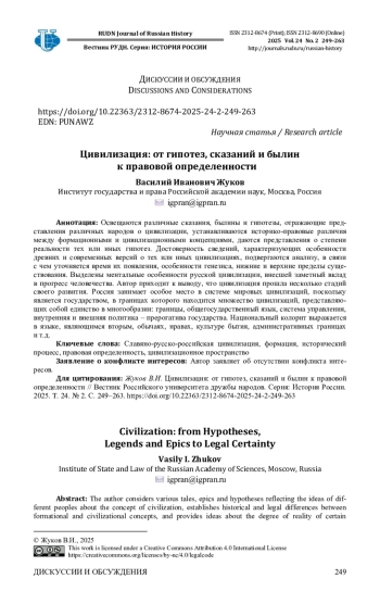 Освещаются различные сказания, былины и гипотезы, отражающие представления различных народов о цивилизации, устанавливаются историко-правовые различия между формационными и цивилизационными концепциями, даются представления о степени реальности тех или иных гипотез. Достоверность сведений, характеризующих особенности древних и современных версий о тех или иных цивилизациях, подвергаются анализу, в связи с чем уточняется время их появления, особенности генезиса, нижние и верхние пределы существования. Выделены ментальные особенности русской цивилизации, внесшей заметный вклад в прогресс человечества. Автор приходит к выводу, что цивилизация прошла несколько стадий своего развития. Россия занимает особое место в системе мировых цивилизаций, поскольку является государством, в границах которого находится множество цивилизаций, представляющих собой единство в многообразии: границы, общегосударственный язык, система управления, внутренняя и внешняя политика - прерогатива государства. Национальный колорит выражается в языке, являющимся вторым, обычаях, нравах, культуре бытия, административных границах и т. д.