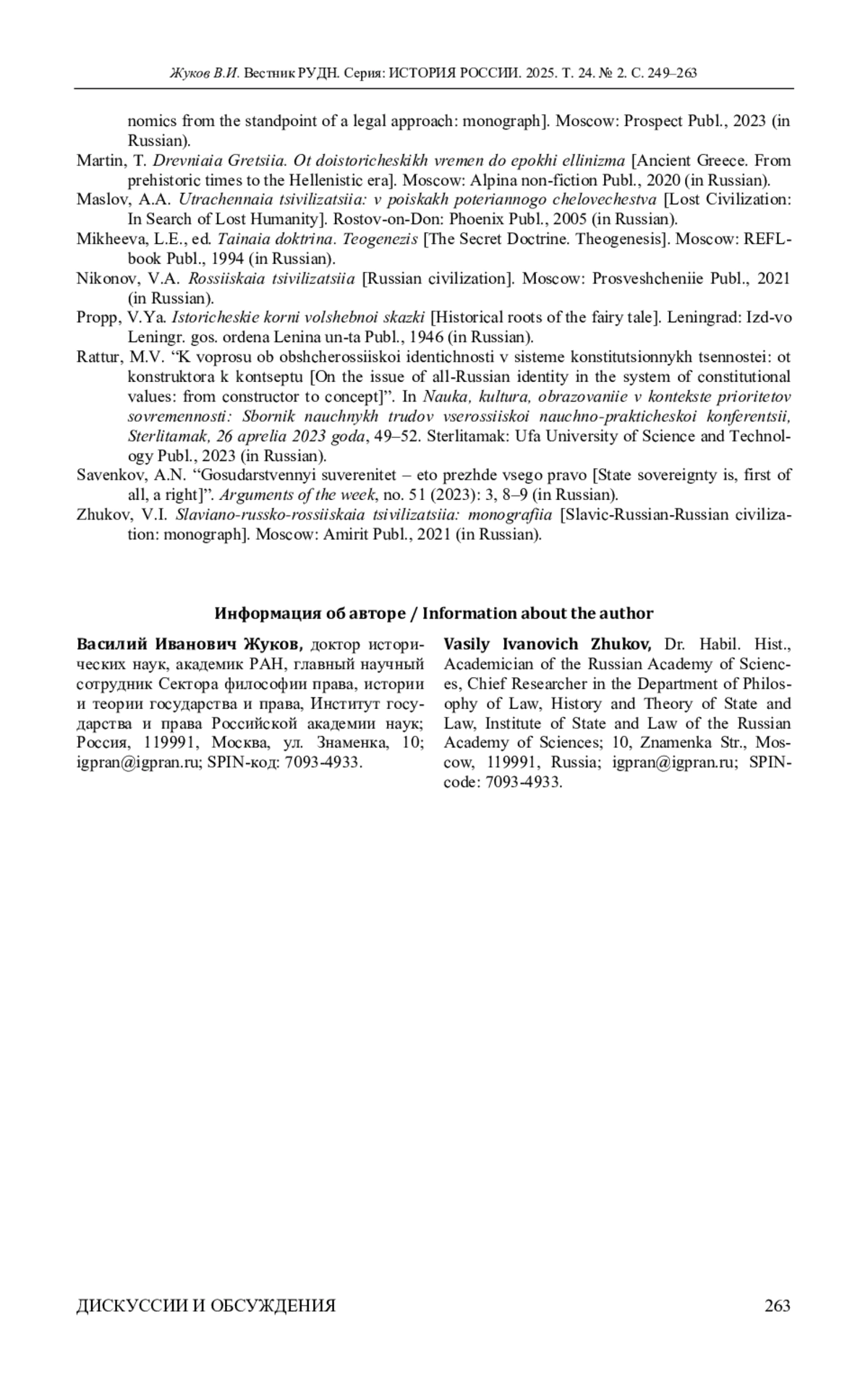 12. Zhukov, V.I. Slaviano-russko-rossiiskaia tsivilizatsiia: monografiia [Slavic-Russian-Russian civilization: monograph]. Moscow: Amirit Publ., 2021 (in Russian).