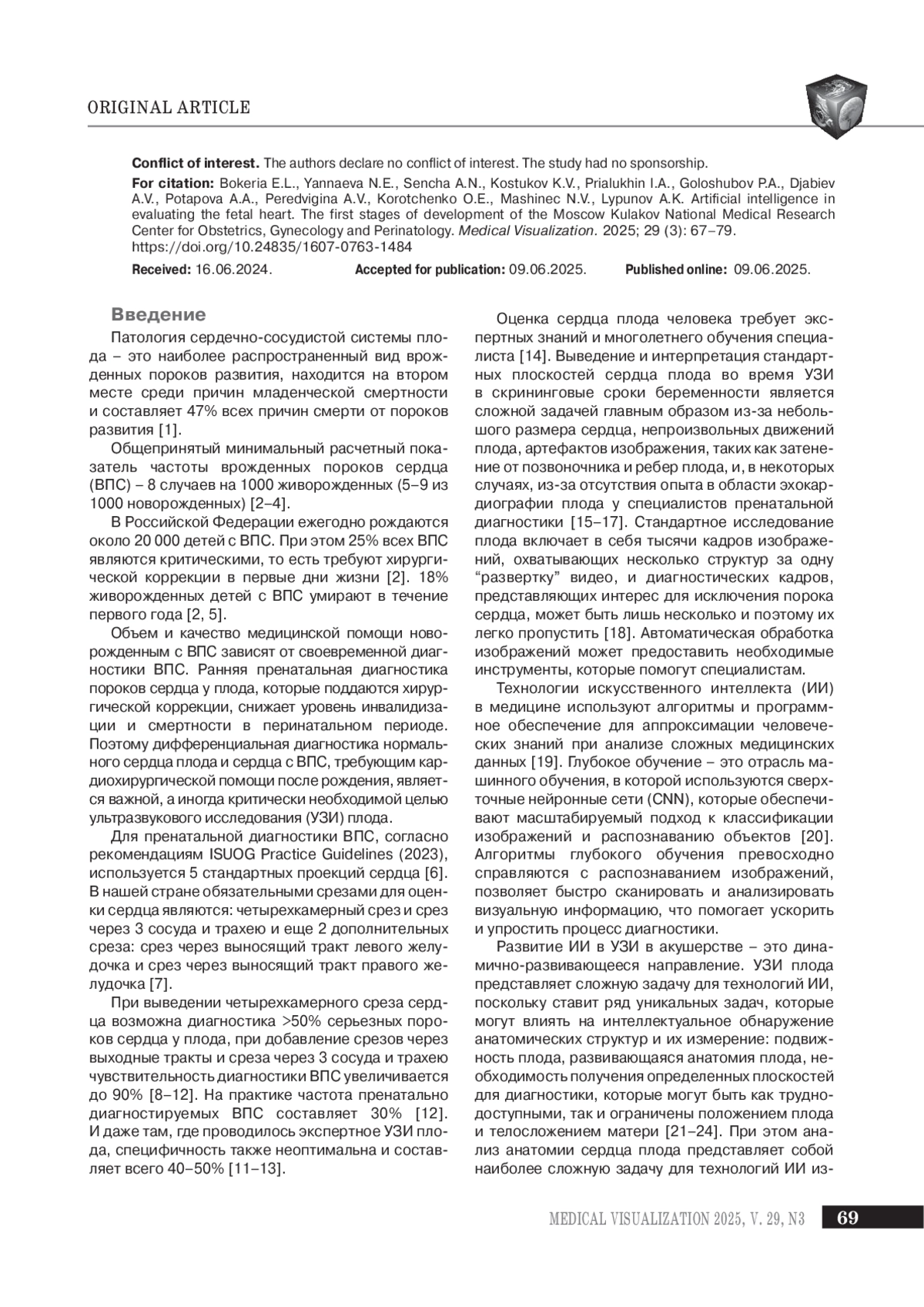 Цель исследования: создание системы поддержки принятия врачебных решений путем формирования алгоритма осмотра сердца плода с помощью искусственного интеллекта, результатом которого должен стать один из вариантов медицинского заключения: “норма” – правильное строение сердца – ВПС нет; “не норма” – неправильное строение сердца – нельзя исключить наличие ВПС, рекомендована расширенная эхокардиография плода в кратчайшие сроки.