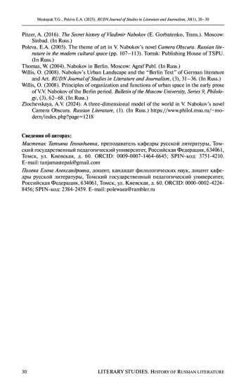 12. Уиллис О. Принципы организации и функции городского пространства в ранней прозе В. В. Набокова берлинского периода // Вестник Московского университета. Серия 9. Филология. 2008. № 3. С. 62-68. EDN: JVAPBN