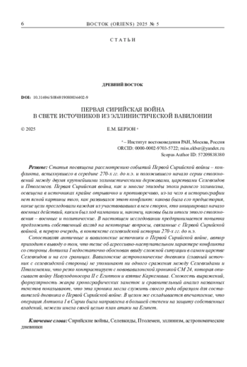 Статья посвящена рассмотрению событий Первой Сирийской войны – конфликта, вспыхнувшего в середине 270-х гг. до н. э. и положившего начало серии столкновений между двумя крупнейшими эллинистическими державами, царствами Селевкидов и Птолемеев. Первая Сирийская война, как и многие эпизоды эпохи раннего эллинизма, освещена в источниках крайне отрывочно и противоречиво, из-за чего в историографии нет ясной картины того, как развивался этот конфликт: какова была его предыстория, какие цели преследовали каждая из участвовавших в нем сторон, кто инициировал начало военных действий, каким был ход кампании и, наконец, каковы были итоги этого столкновения – военные и политические. В настоящем исследовании предпринимается попытка предложить собственный взгляд на некоторые вопросы, связанные с Первой Сирийской войной, в первую очередь, в контексте селевкидской истории 270-х гг. до н. э.