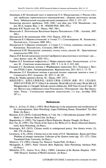 8. Леонтьева А.Ю. Китайский текст в творчестве О.Э. Мандельштама // Россия и Китай: проблемы стратегического взаимодействия: сборник восточного центра. Чита: Забайкальский государственный университет, 2016. С. 123-127.