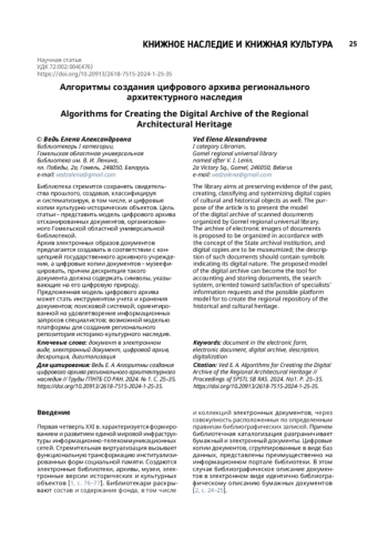 Библиотека стремится сохранять свидетельства прошлого, создавая, классифицируя и систематизируя, в том числе, и цифровые копии культурно-исторических объектов. Цель статьи – представить модель цифрового архива отсканированных документов, организованного Гомельской областной универсальной библиотекой. Архив электронных образов документов предлагается создавать в соответствии с концепцией государственного архивного учреждения, а цифровые копии документов – музеефицировать, причем дескрипция такого документа должна содержать символы, указывающие на его цифровую природу. Предложенная модель цифрового архива может стать инструментом учета и хранения документов; поисковой системой, ориентированной на удовлетворение информационных запросов специалистов; возможной моделью платформы для создания регионального репозитория историко-культурного наследия.