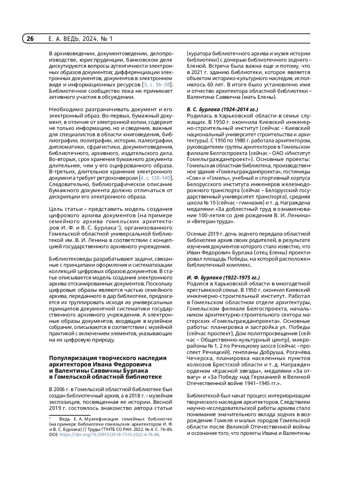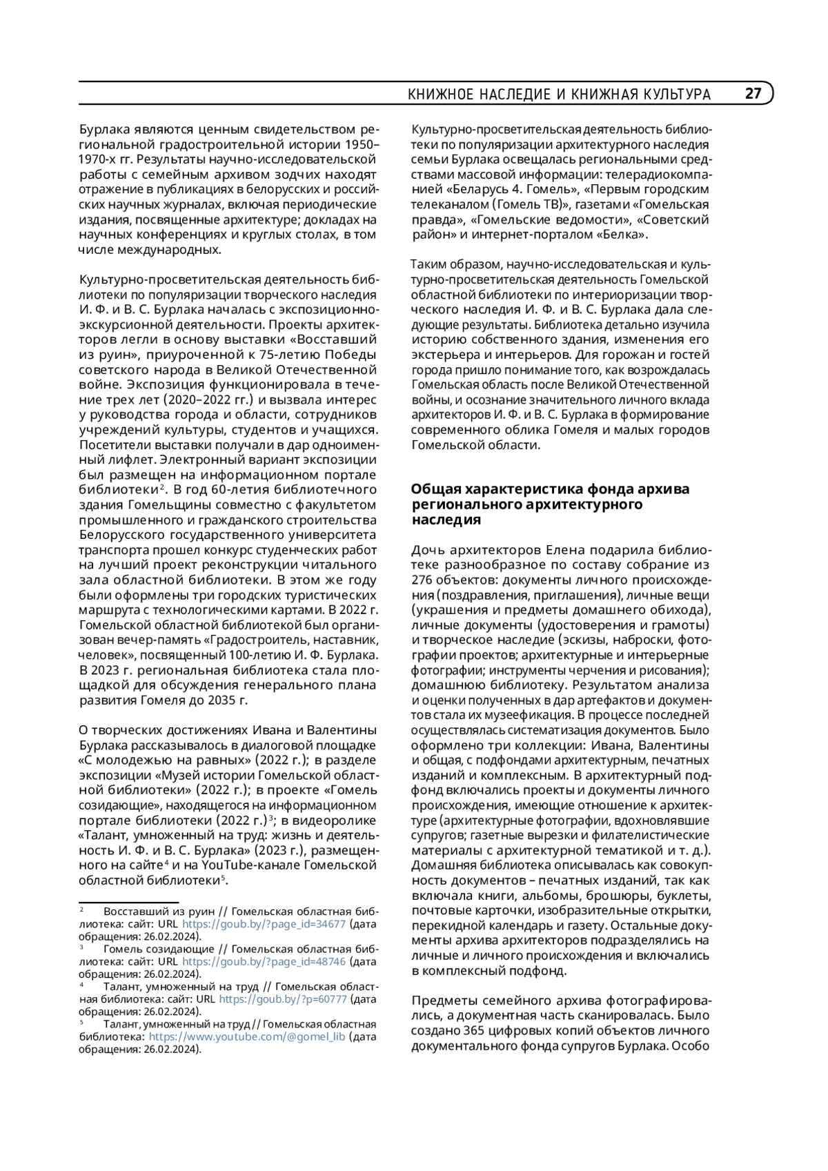 В 2019 году крупнейшая региональная книжница Гомельщины стала обладателем уникального архива И. Ф. и В. С. Бурлака. Подаренные материалы сканировались. Исключительно в электронной форме было передано свыше 50 % экспонатов. Поэтому возникла необходимость в создании Цифрового архива, при организации которого автором данной статьи было принято решение опираться на практику государственного архивного учреждения.