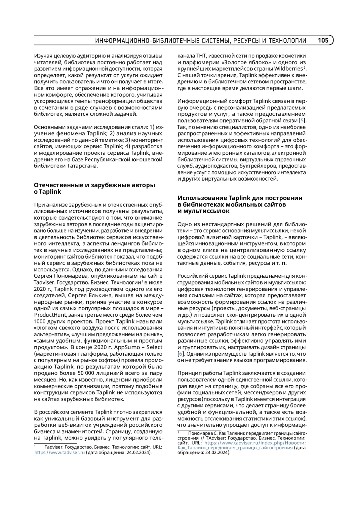 Цель статьи – представить результаты исследования нового цифрового феномена Taplink, а также разработки и внедрения результатов пилотного проекта Республиканской юношеской библиотеки Татарстана для оценки эффективности использования этой цифровой платформы в ее деятельности, анализа взаимодействия библиотеки и потребителей на этой платформе, изучения статистики посещения и функционирования интерактивной системы. Предложенный проект является уникальным, поскольку не имеет аналогов в библиотеках Российской Федерации, а сама тематика Taplink представлена только в публикациях бизнес-сообщества и не освещается в научных публикациях библиотечной отрасли. Результаты исследования могут оказать существенное содействие в развитии комфортного цифрового пространства библиотек.