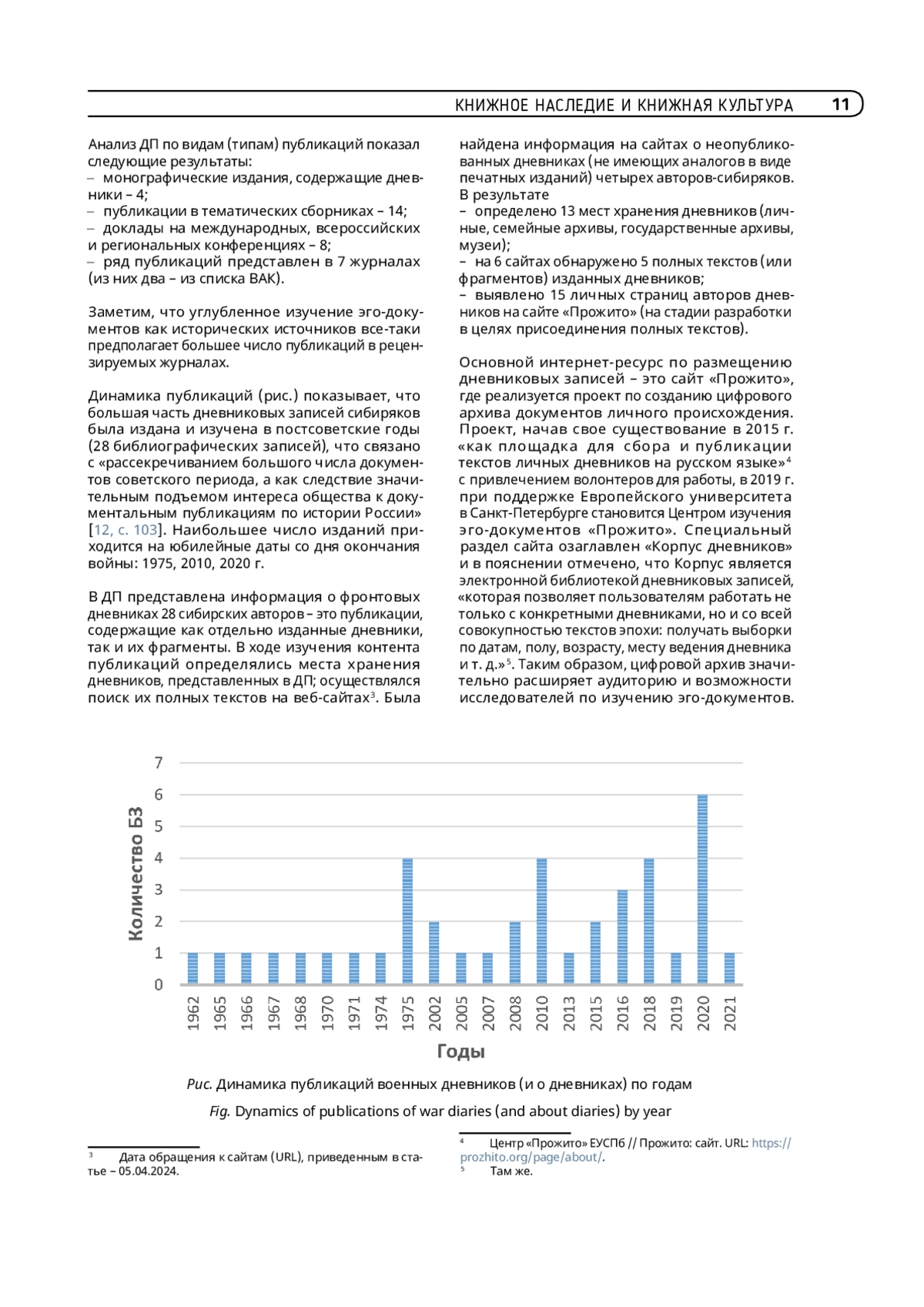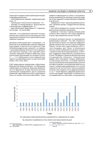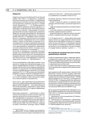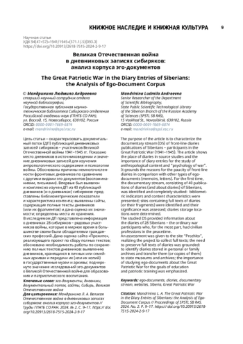 Цель статьи – охарактеризовать документальный поток (ДП) публикаций дневниковых записей сибиряков – участников Великой Отечественной войны 1941–1945 гг. Показано место дневников в источниковедении и значение дневниковых записей для изучения антропологического содержания и психологии войны. Обоснованы причины немногочисленности фронтовых дневников по сравнению с другими видами эго-документов (воспоминаниями, письмами). Впервые был выявлен и комплексно изучен ДП из 40 публикаций дневников (и о дневниках) сибиряков: представлены библиометрические показатели и характеристика контента; выявлены сайты, содержащие полные тексты дневников (или их фрагментов) и дана оценка их значимости; определены места их хранения. В исследуемом ДП представлена информация о дневниках 28 сибиряков – рядовых участников войны, которые в мирное время в большинстве своем были обладателями гражданских профессий. Дана оценка сайта «Прожито», реализующего проект по сбору полных текстов; обоснована необходимость работы по сохранению полных текстов дневников: выявлению дневников, хранящихся в личных или семейных архивах и передачи их (или их копий) в государственные музеи и архивы; подчеркнуто значение исследований эго-документов о Великой Отечественной войне для образования и патриотического воспитания.