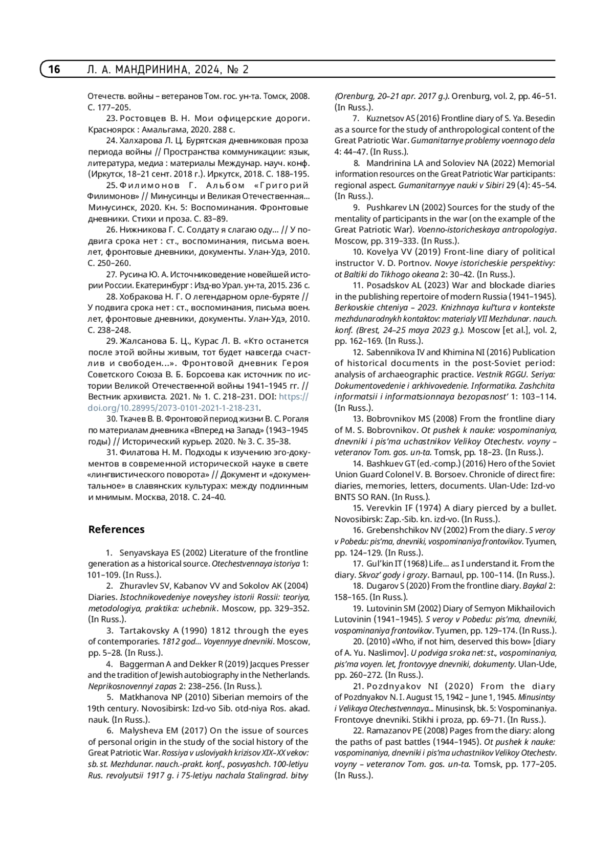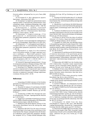8. Мандринина Л. А., Соловьев Н. А. Мемориальные информационные ресурсы об участниках Великой Отечественной войны: региональный аспект // Гуманитарные науки в Сибири. 2022. Т. 29, № 4. С. 45-54.