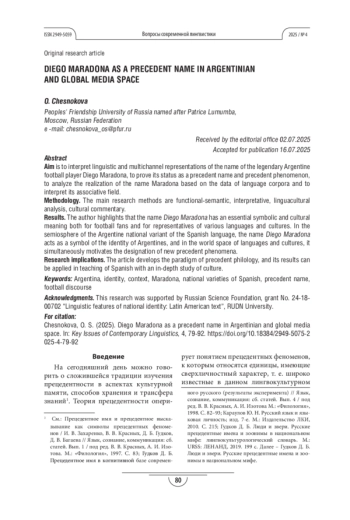 Цель. Интерпретировать лингвистические и поликанальные репрезентации имени легендарного аргентинского футболиста Диего Марадоны, обосновать его статус как прецедентного имени и прецедентного феномена, проанализировать по данным языковых корпусов реализацию имени Марадона и интерпретировать его ассоциативное поле.