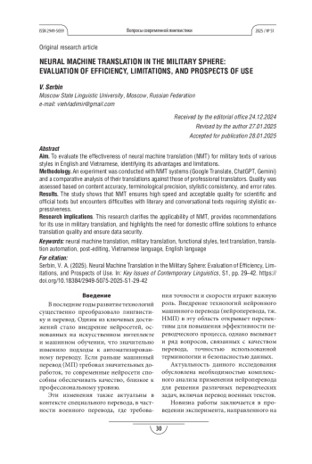 Цель исследования - оценить эффективность нейронного машинного перевода (НМП) для военных текстов различных стилей на английском и вьетнамском языках, выявить преимущества и ограничения технологии.