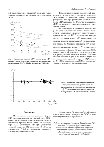 На основании анализа динамики формы SXR-спектров, температуры тепловой части SXRспектров и экспериментально определенного энергетического времени жизни плазмы на стеллараторе Л-2М установлено, что при увеличении удельной мощности ЭЦР-нагрева до 3,0 МВ/м3 на стеллараторе Л-2М не происходит заметного ухудшения удержания плазмы.