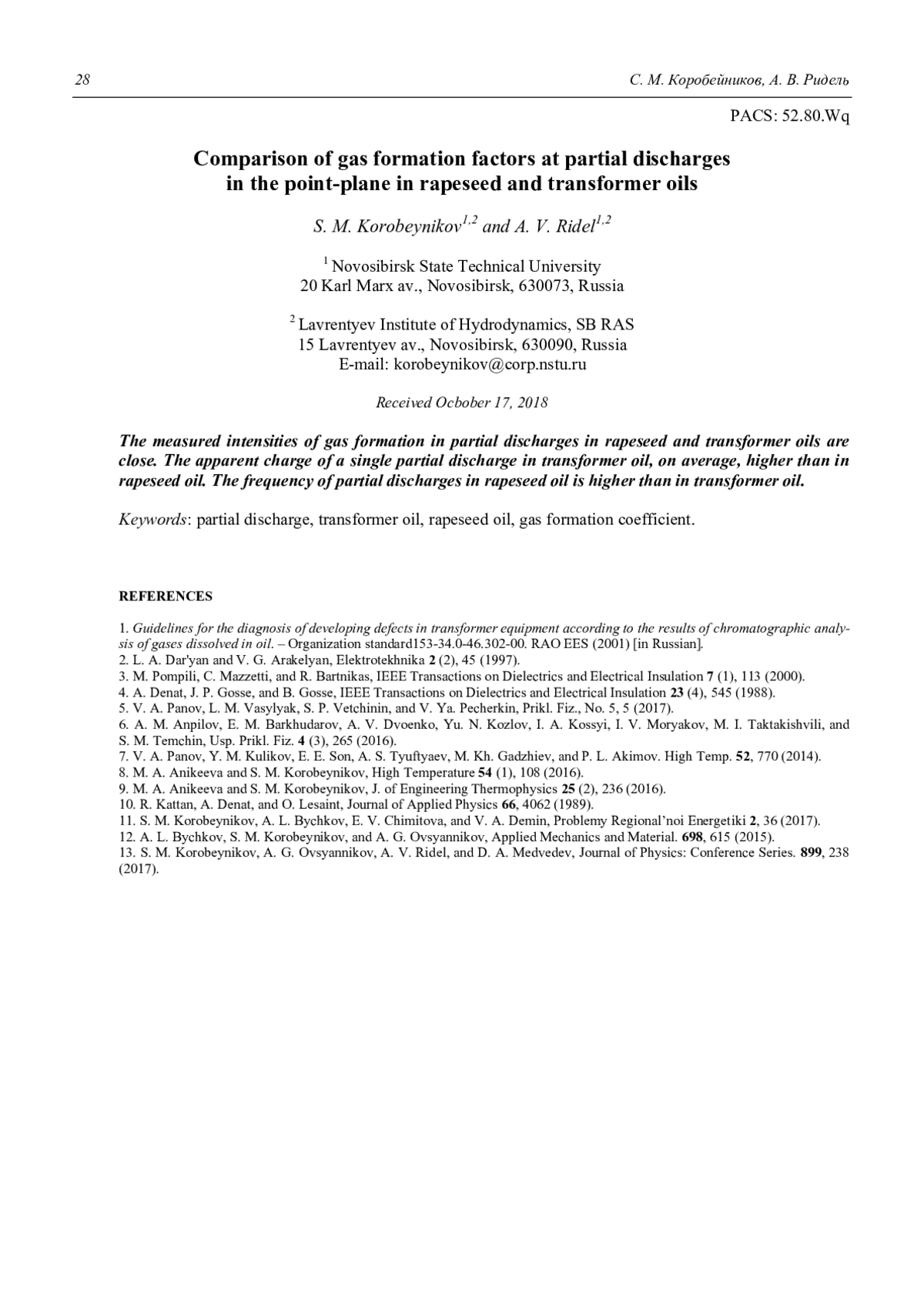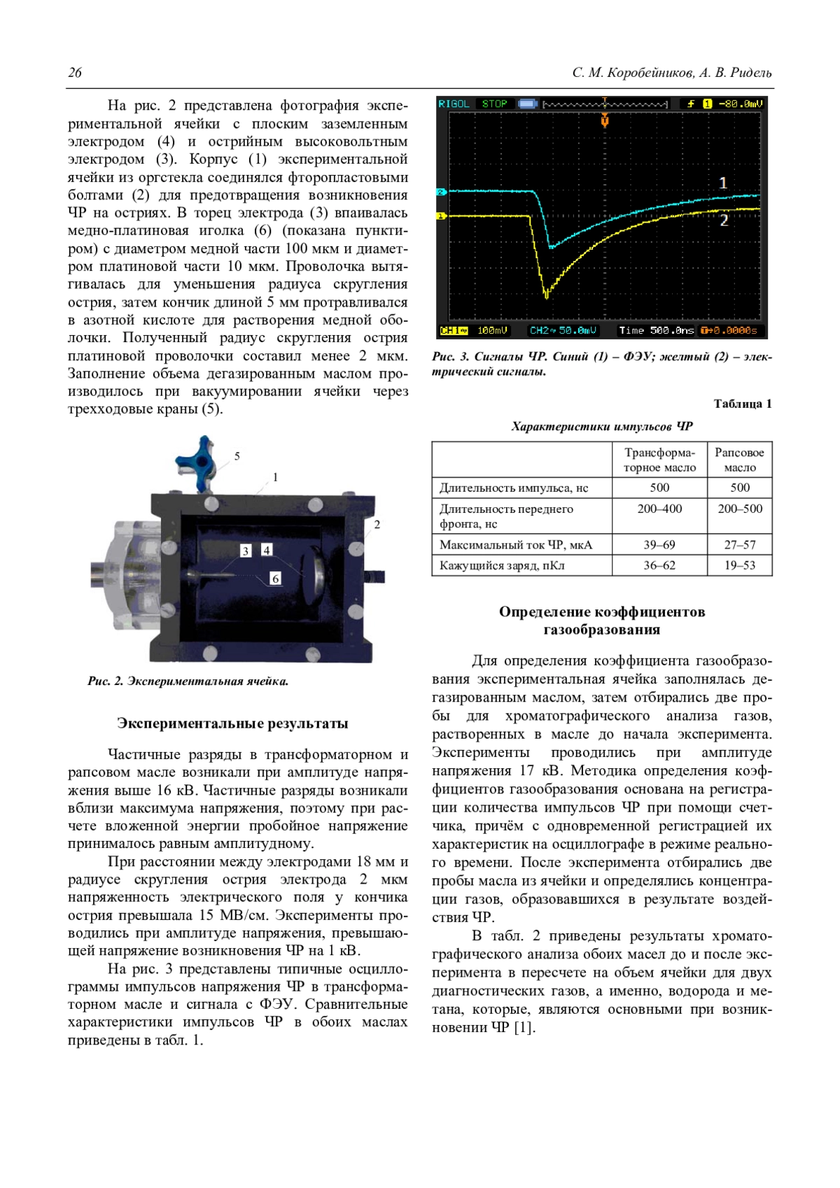 Коробейников С. М., Ридель А. В. Сравнение коэффициентов газообразования при частичных разрядах в системе острие – плоскость в рапсовом и трансформаторном маслах 25